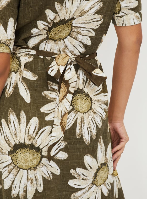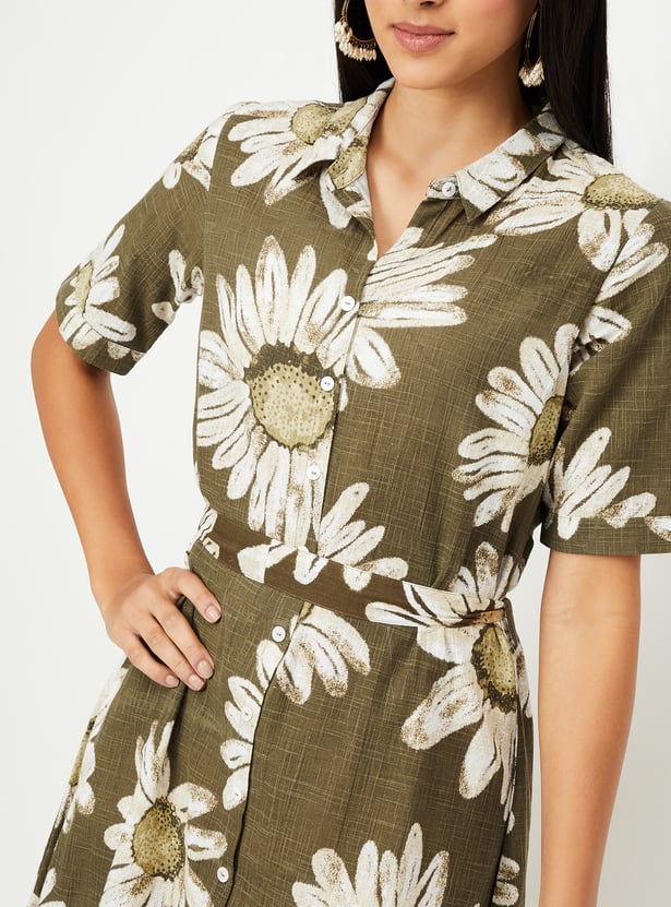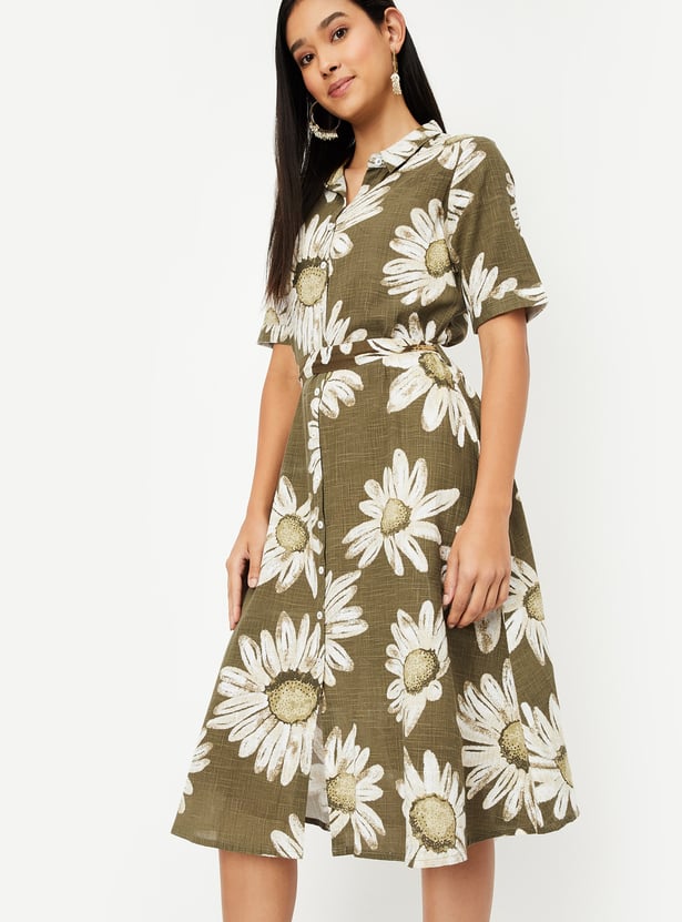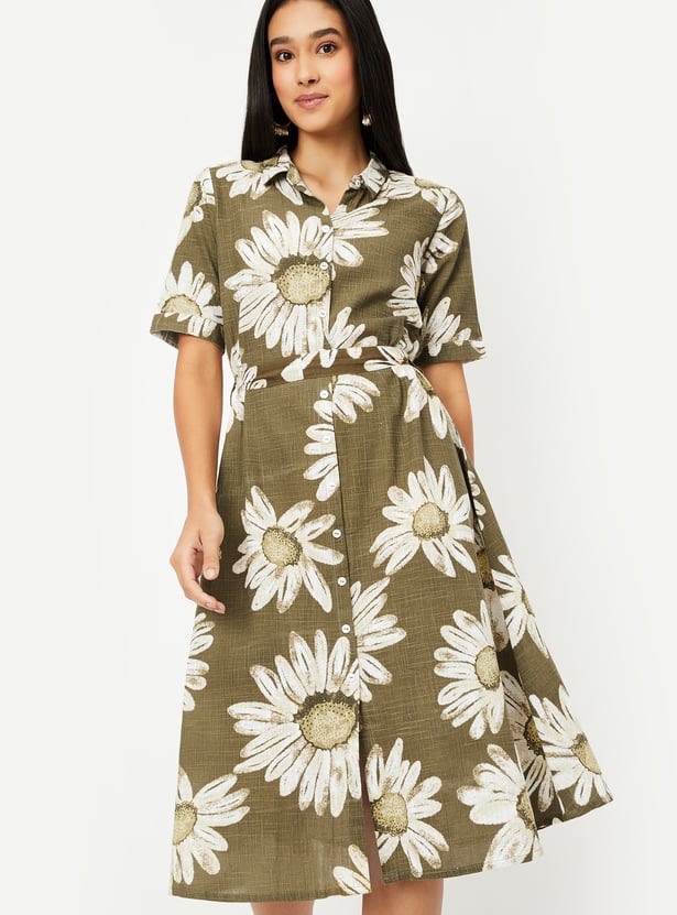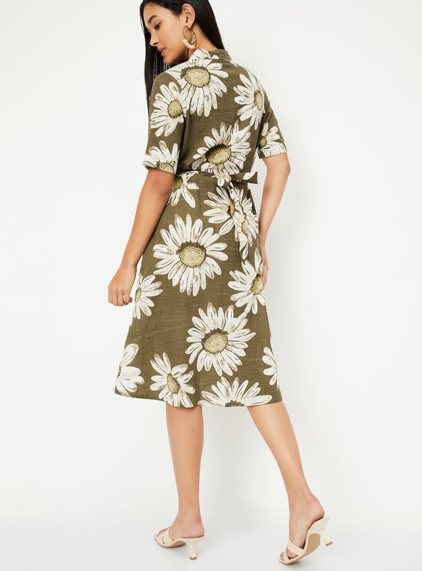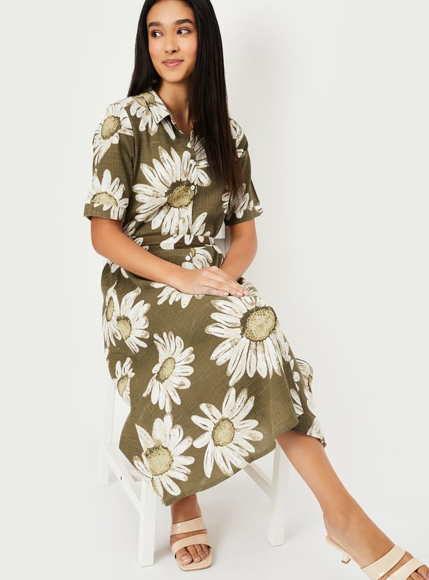 This floral print dress combines feminine charm with a flattering A-line silhouette. Featuring a collared design, half sleeves, and button closure, it’s both stylish and comfortable. The belted waist enhances the shape, making it perfect for casual outings or semi-formal occasions.