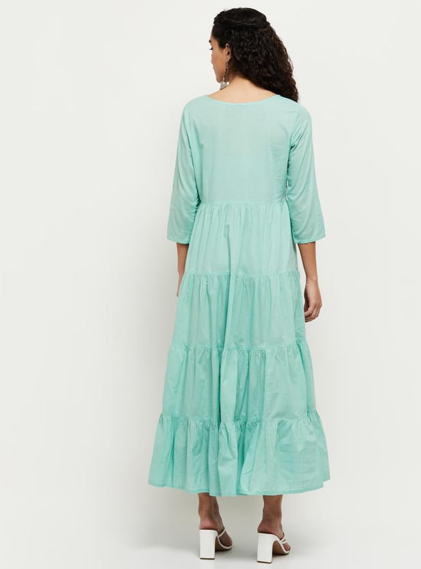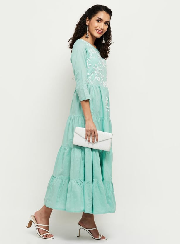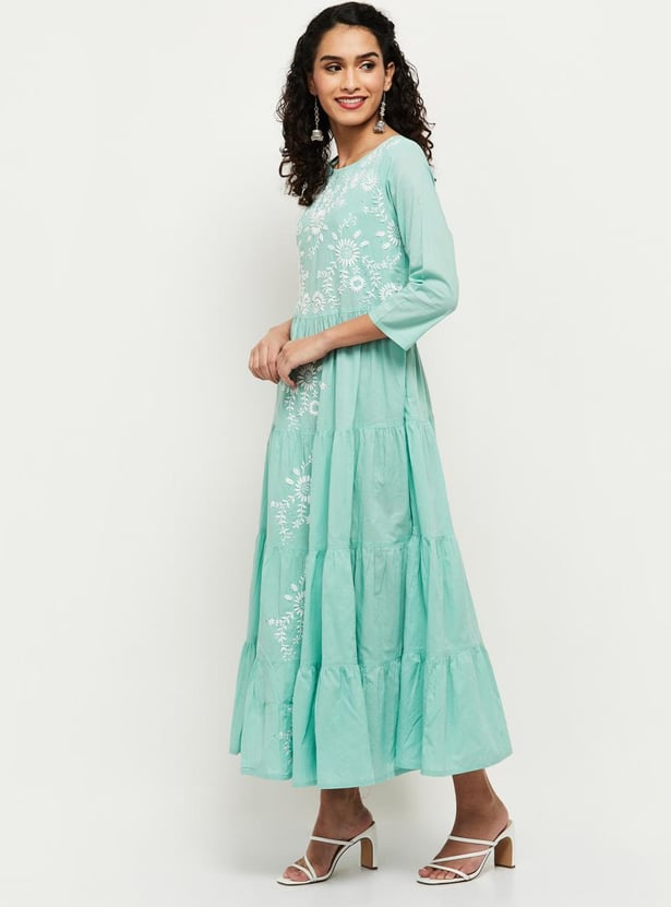 Upgrade your ethnic wardrobe with this tiered Chikankari dress that features three-quarter sleeves and floral embroidery with a maxi silhouette.