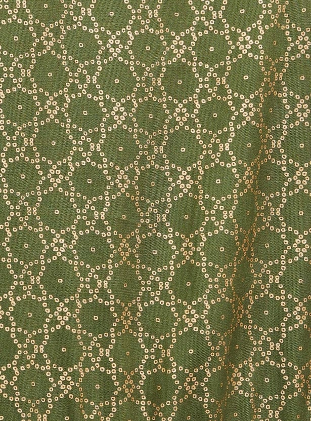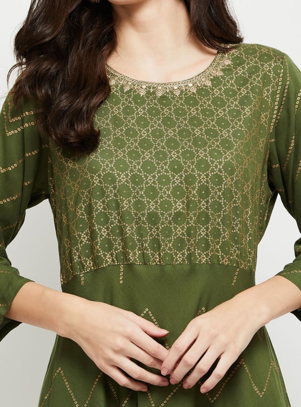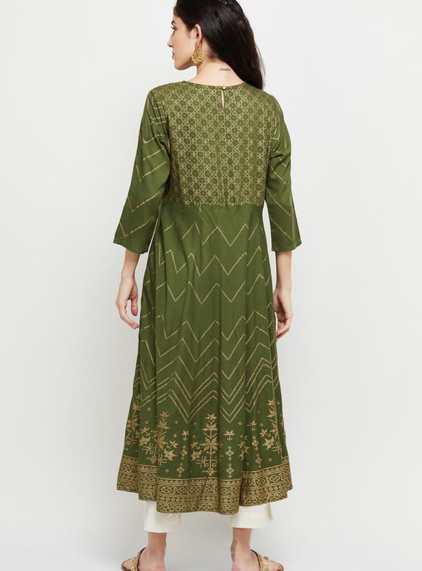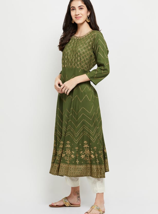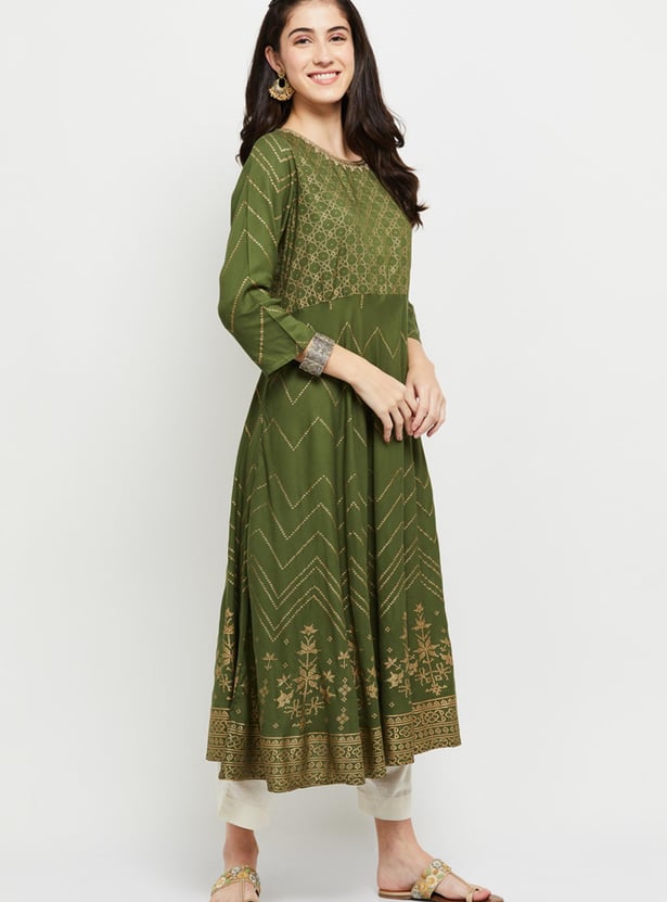 Twirl in your ethnic wear with this printed A-line kurta which has a round neck, three-quarter sleeves, and a calf-length construction.