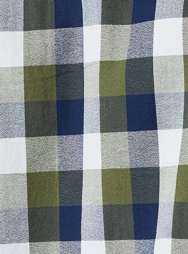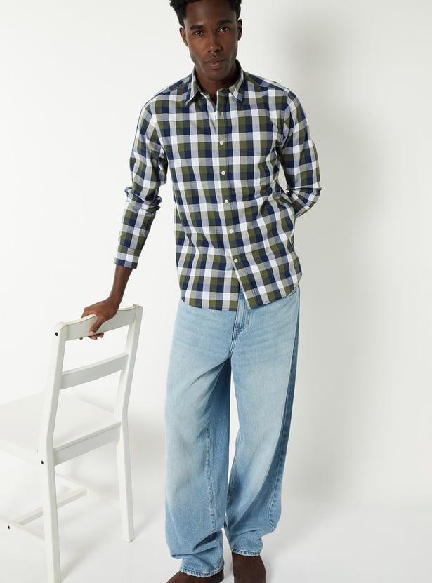 Amp up your casual-smart look with this men’s checked slim fit shirt. Designed with a spread collar, button-down closure, curved hem, and cuffed full sleeves, it offers a tailored silhouette with a timeless appeal.