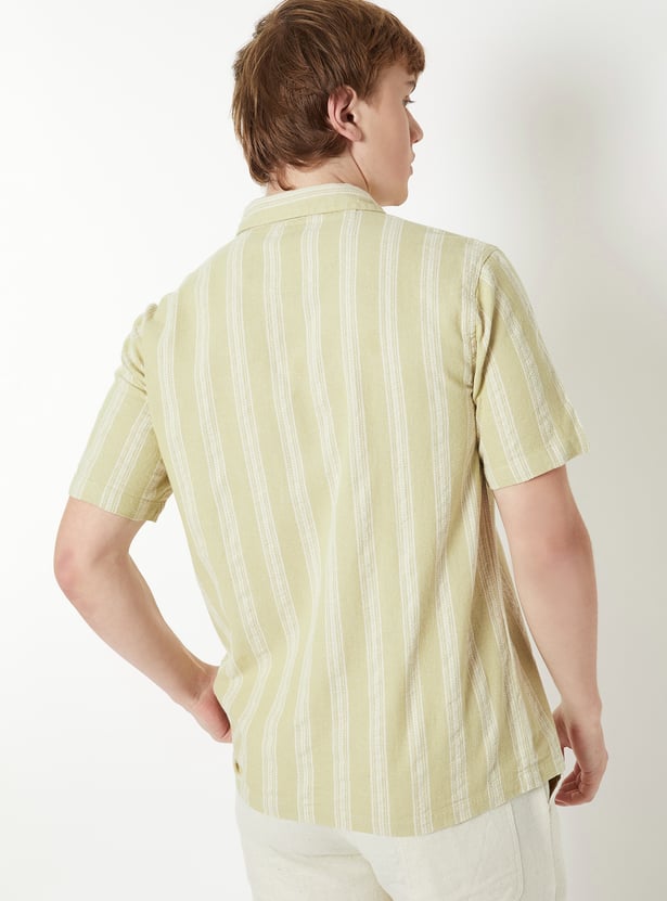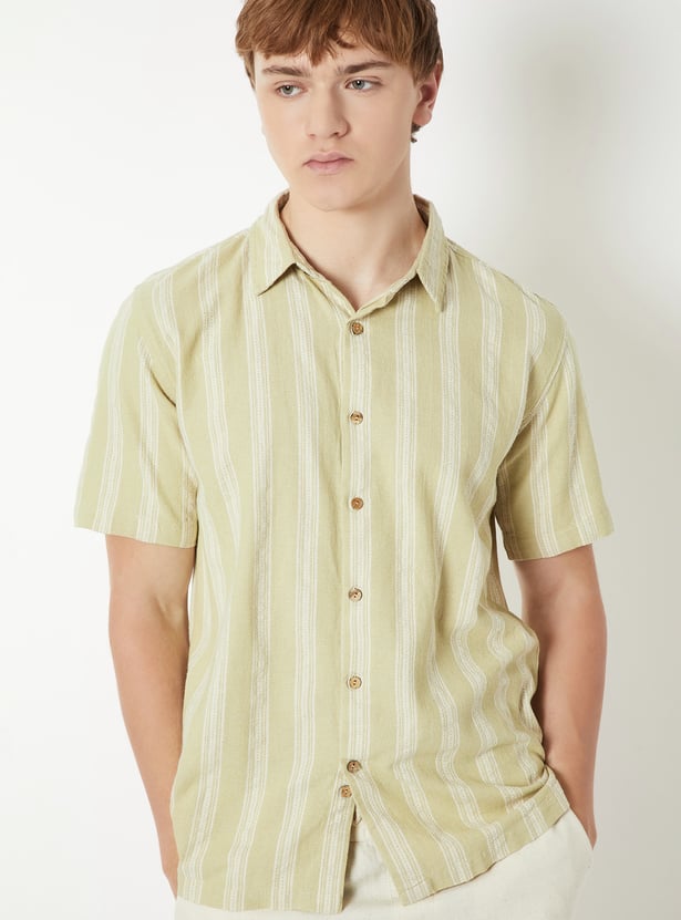 Add a touch of charm to your wardrobe with this knit striped slim fit shirt. It features a spread collar, button closure, and half sleeves, making it a versatile pick for casual outings.