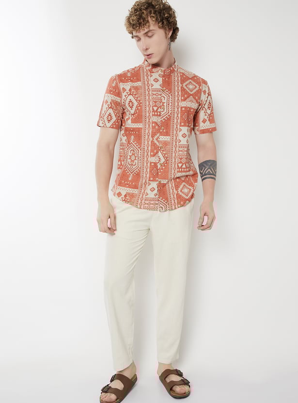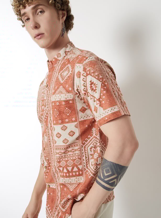 Make a statement with this printed slim fit ethnic shirt, perfect for festive and casual occasions alike. It features a band collar, half button placket, and comfortable half sleeves. The vibrant print adds a lively touch to the classic silhouette.