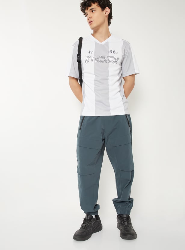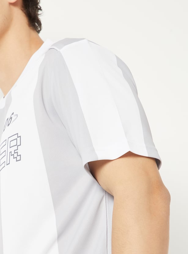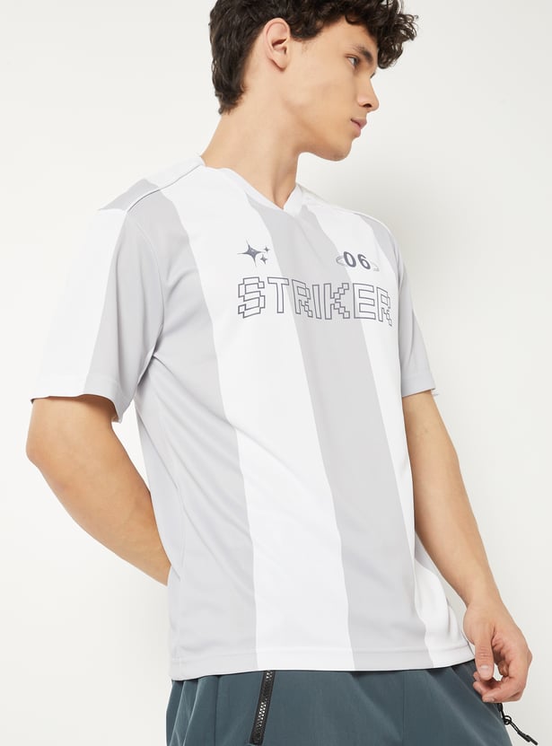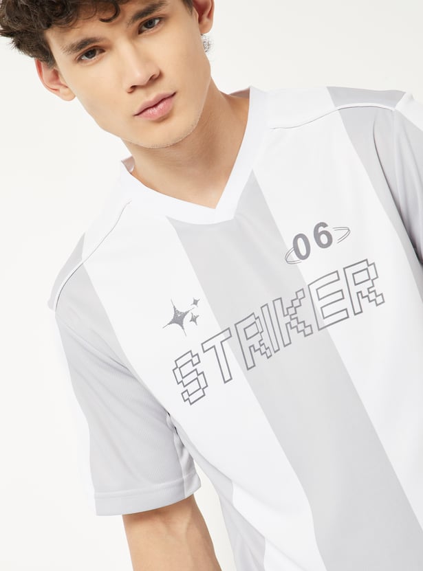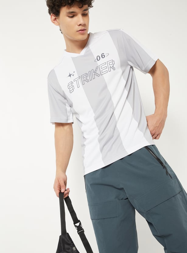 Elevate your activewear with this printed sports T-shirt, designed with a classic V-neck and comfortable half sleeves