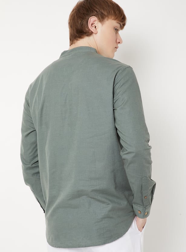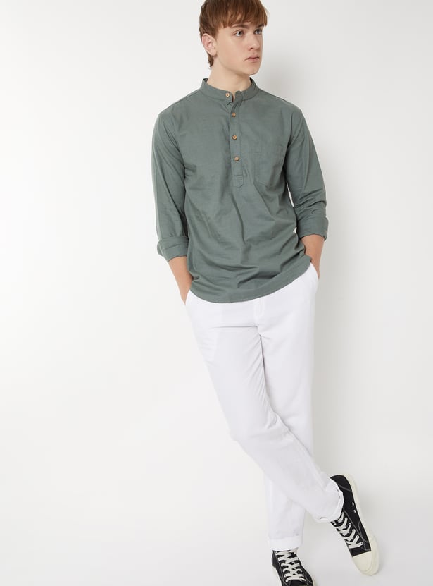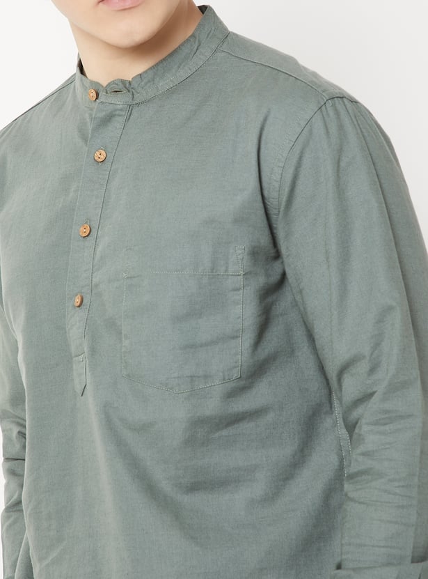 A timeless staple for effortless style, this solid short kurta comes with a neat band collar, full sleeves, and a functional patch pocket for a touch of utility.
