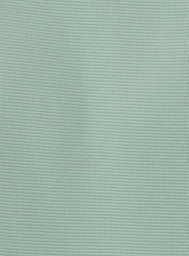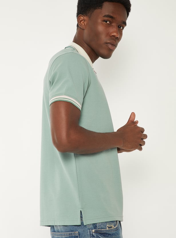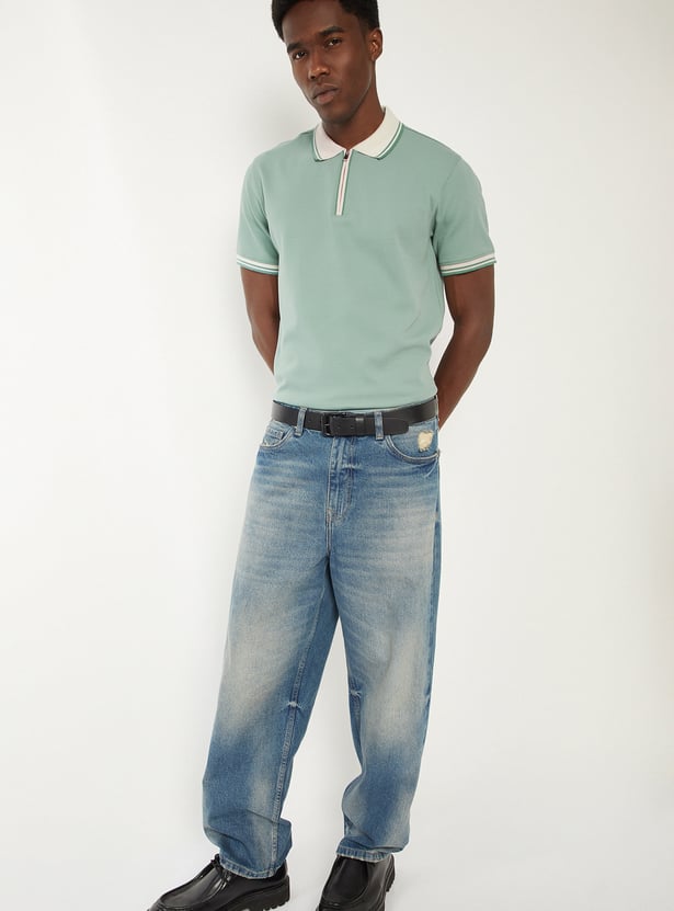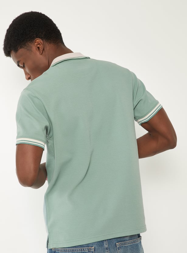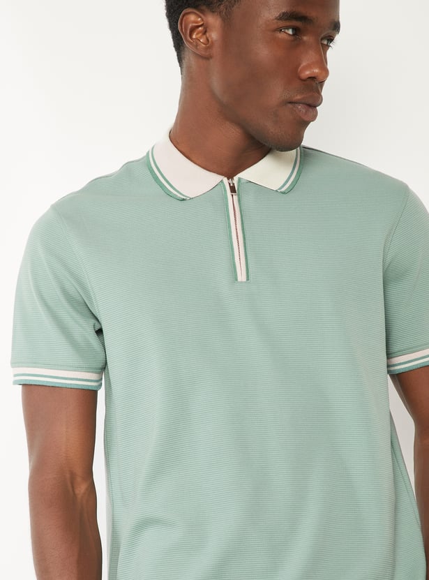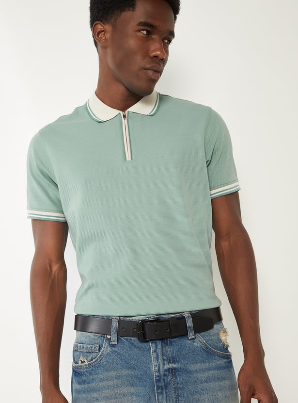 Elevate your wardrobe with this textured polo shirt featuring a sleek zipper closure. Designed with a polo collar, half sleeves, and ribbed cuffs, it offers a smart casual look. The regular fit ensures comfort for everyday wear, with no pockets for a streamlined style.