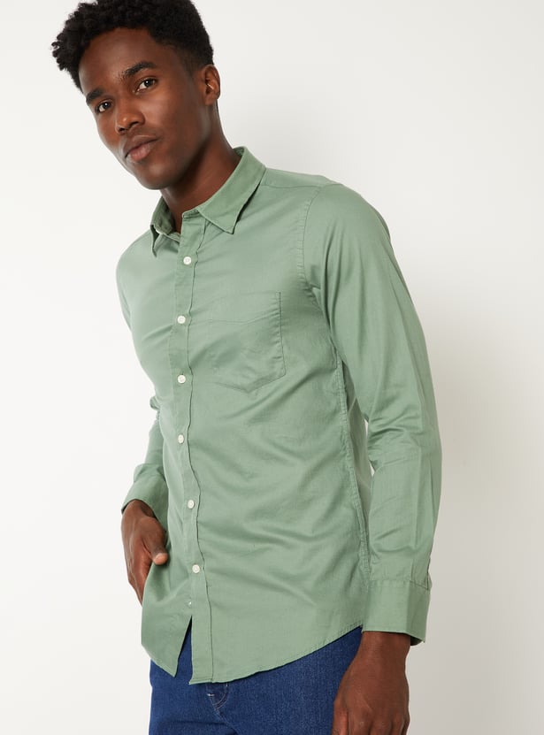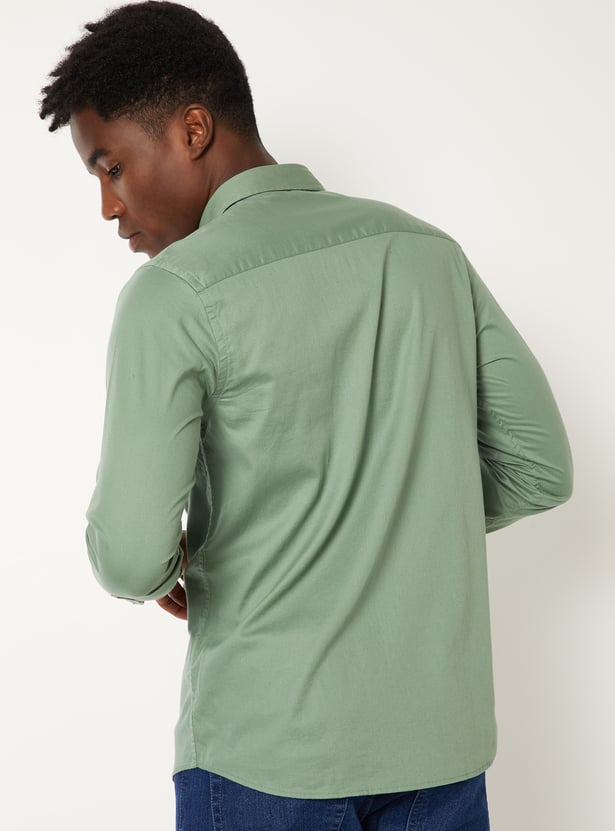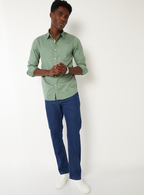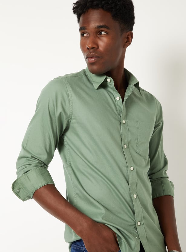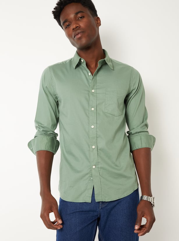 Upgrade your wardrobe with this textured regular fit shirt, featuring a spread collar, button placket, full sleeves with button cuffs, and a patch pocket. A timeless essential with a modern finish.