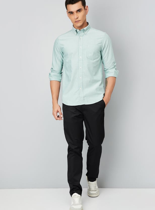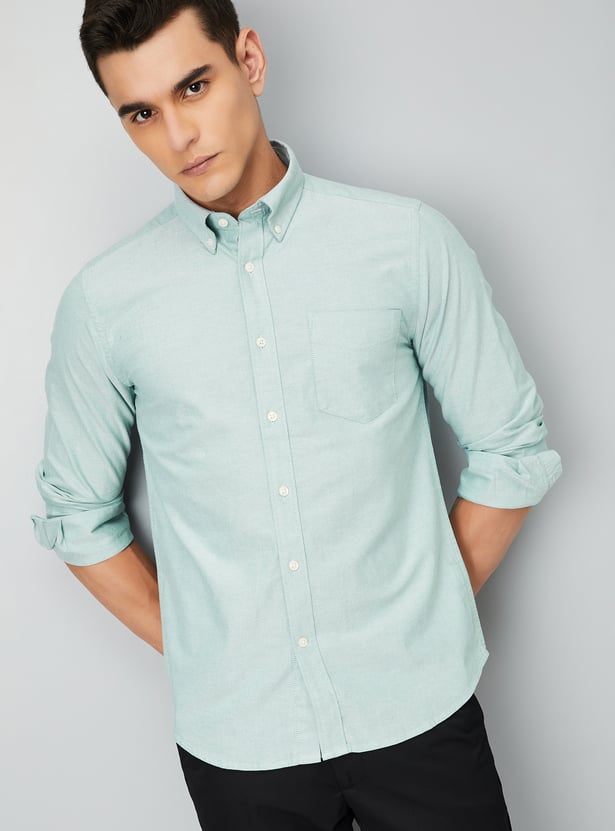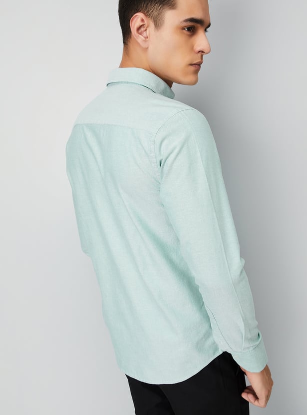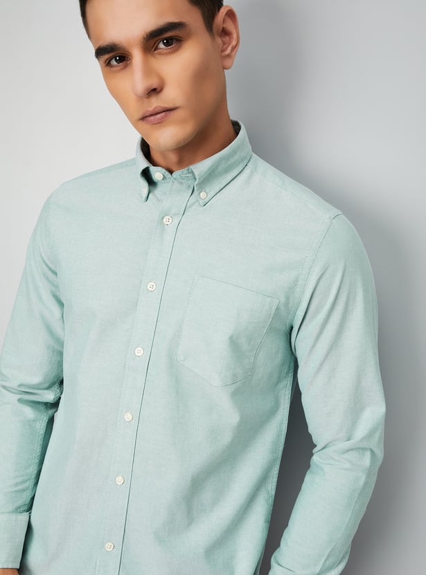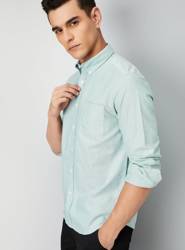 This textured slim-fit shirt combines style and sophistication with a button placket, button-down collar, and full sleeves with button cuffs. The patch pocket adds a functional touch to this sharp, tailored look.