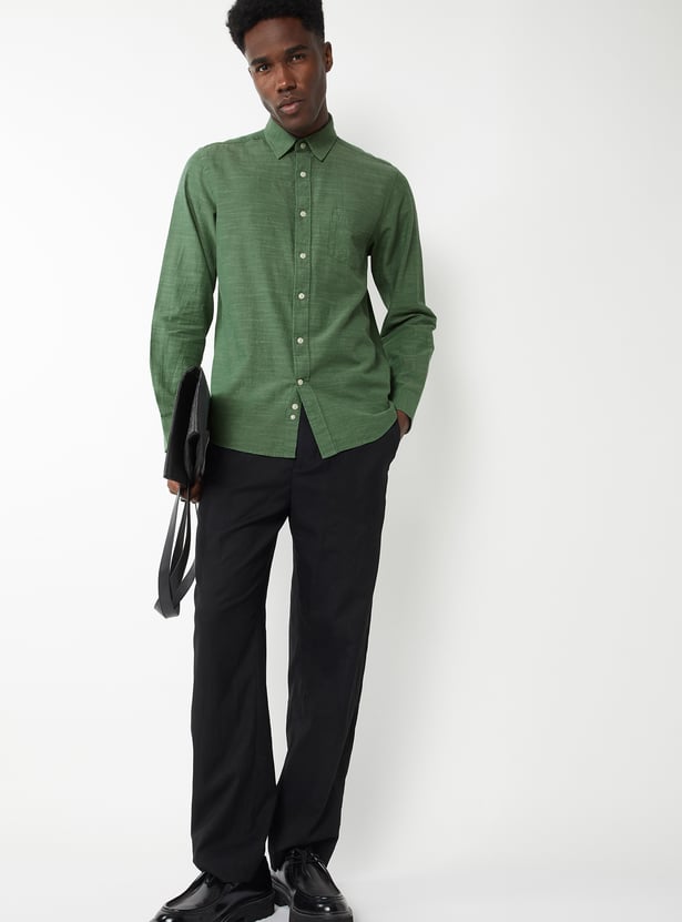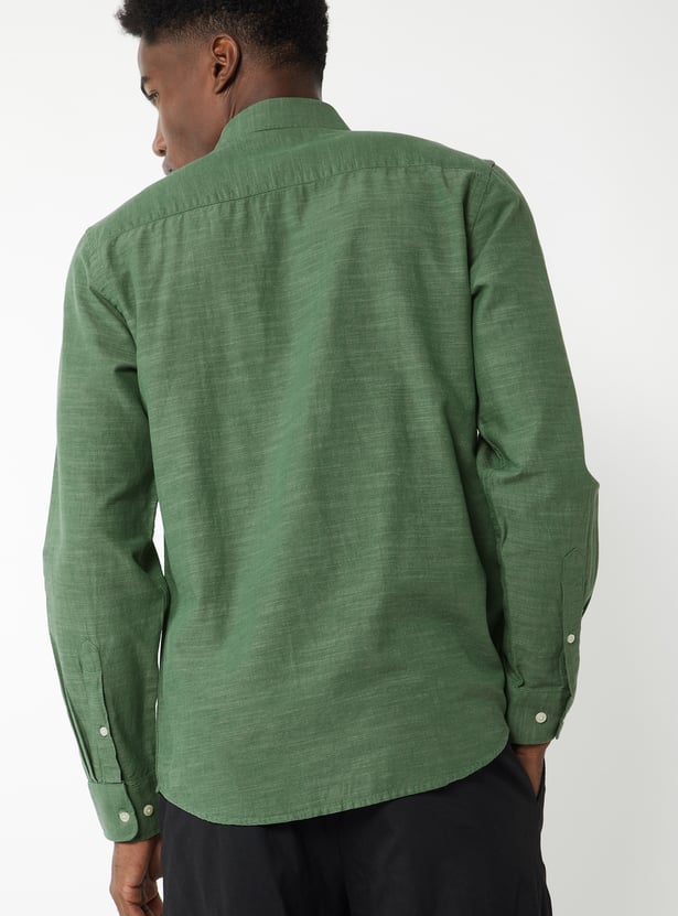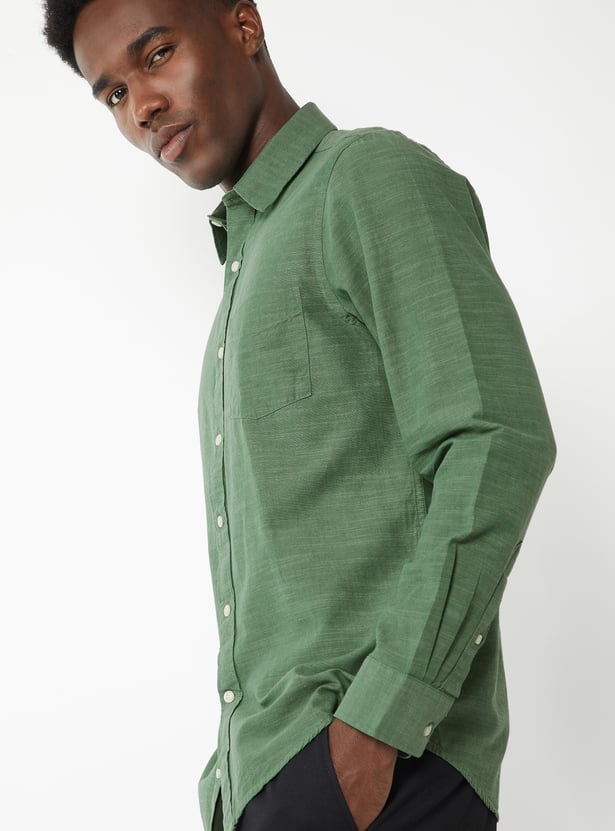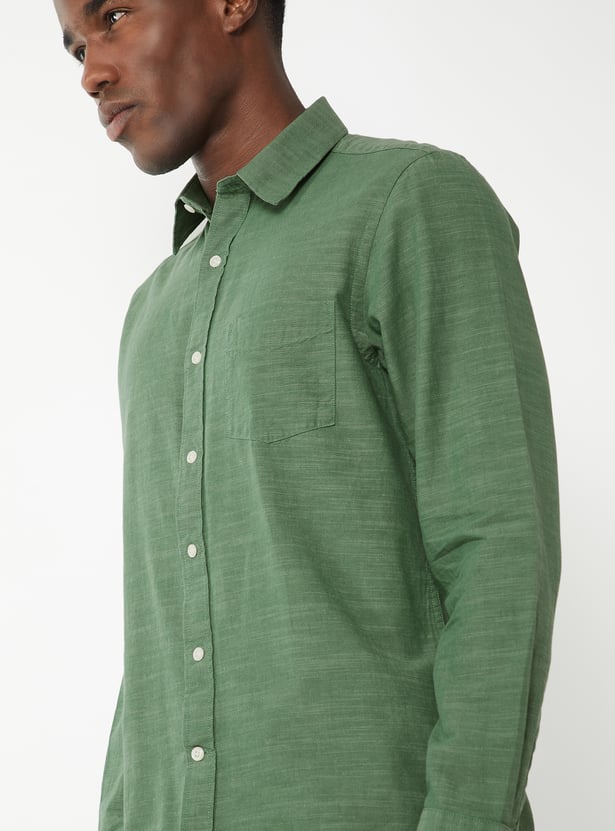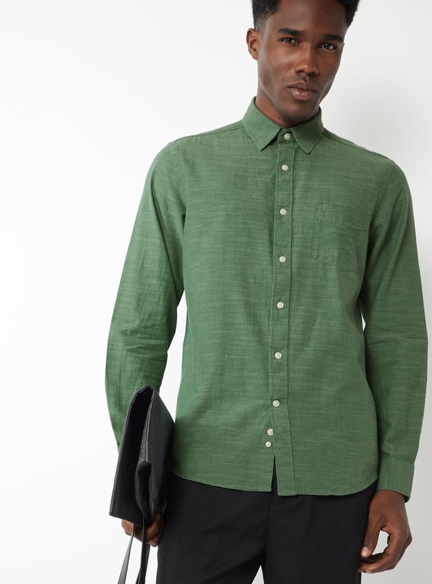 A classic textured shirt featuring a smart spread collar and a neat button placket. Designed with full sleeves and button cuffs, it also includes a practical patch pocket for everyday ease.