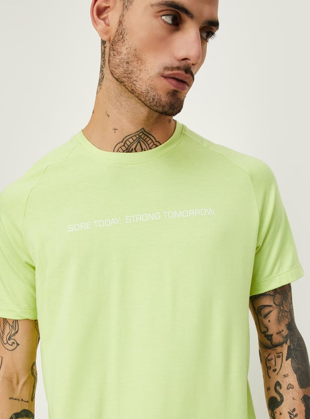 Get ready for gym in style in this T-shirt. It features a crew neck, short sleeves, and a typographic print on the chest. Team up this tee with a pair of active shorts and sneakers to complete the look.