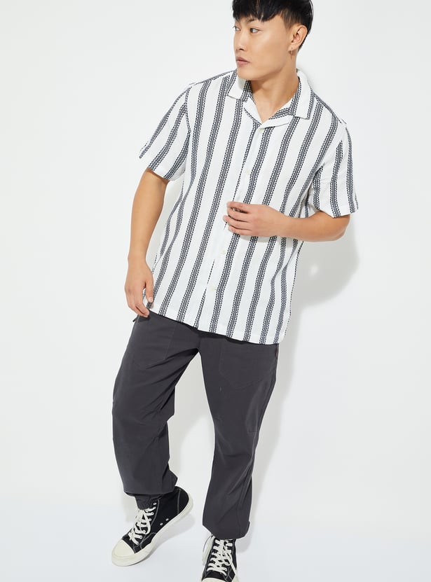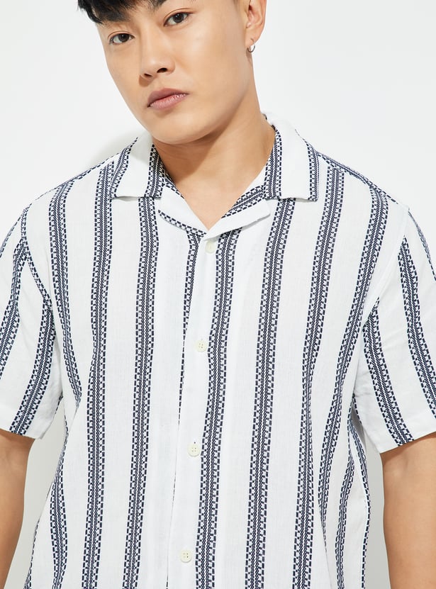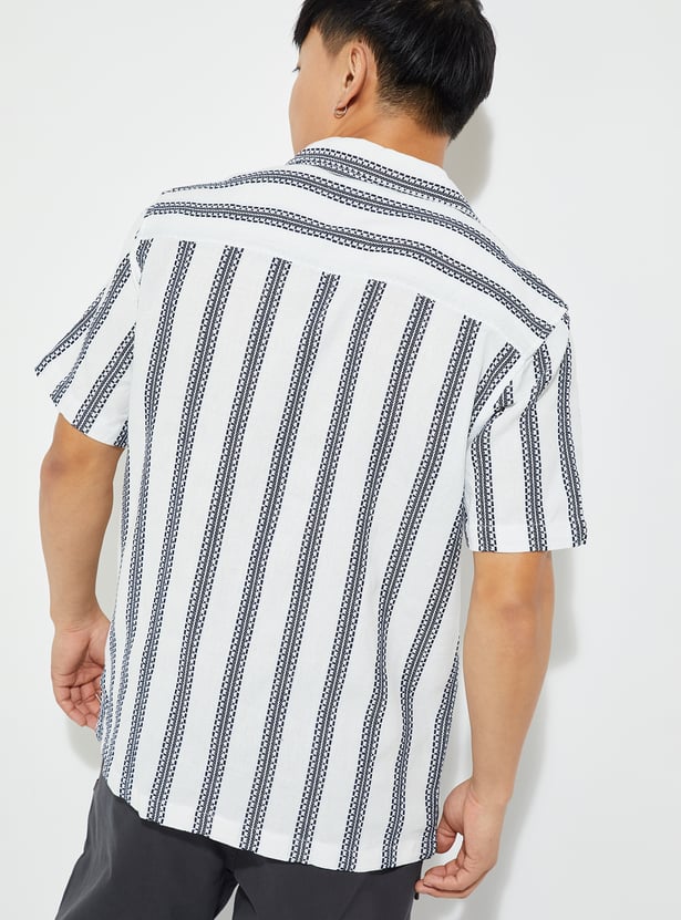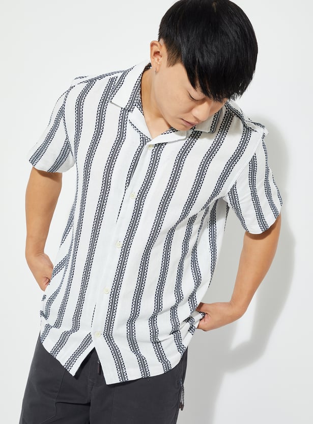 Bring subtle sophistication to your casual look with this casual shirt. Featuring a resort collar and half sleeves, it’s designed for relaxed, warm-weather dressing. The embroidered stripes add texture and detail, while the straight hem keeps the silhouette easy and modern.