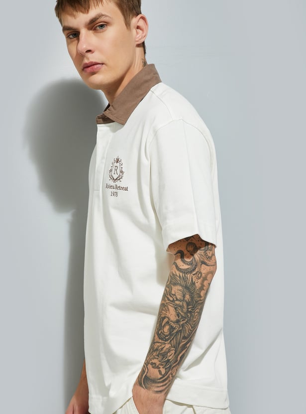 Make a bold statement with this contrast collar oversized polo T-shirt, designed with a classic button placket and comfortable half sleeves. The relaxed silhouette adds a laid-back edge, while the contrast collar brings a modern, sporty vibe.