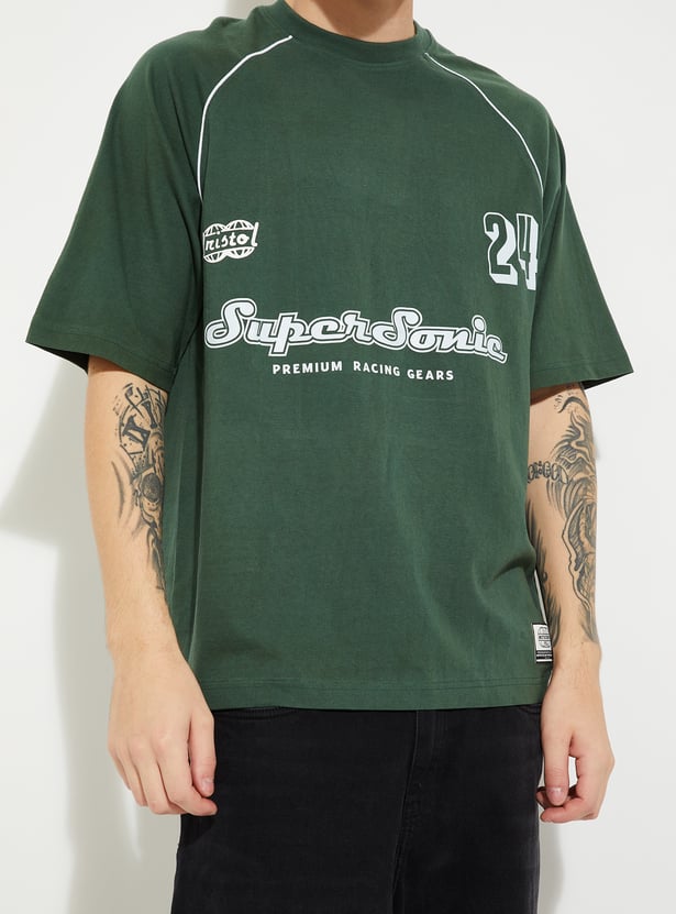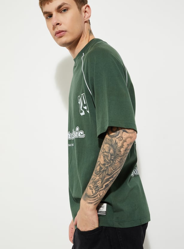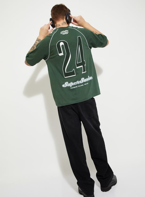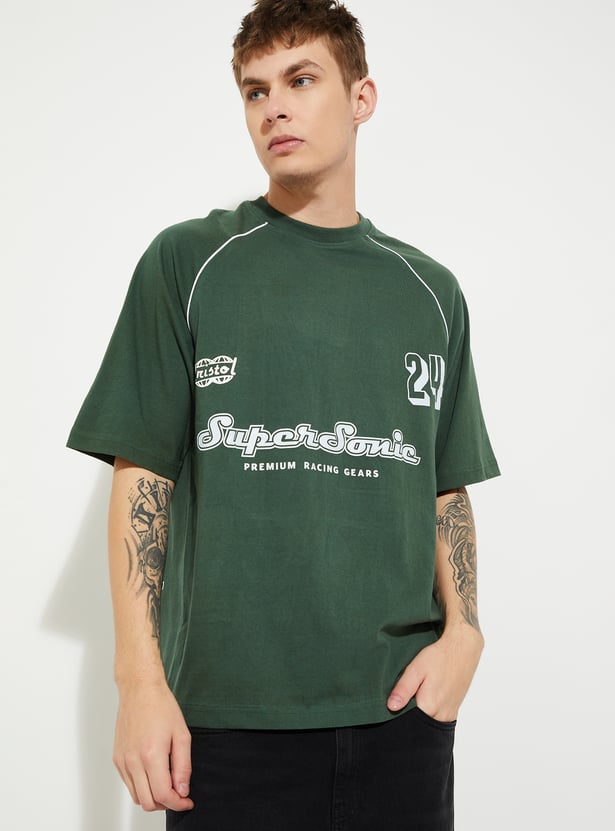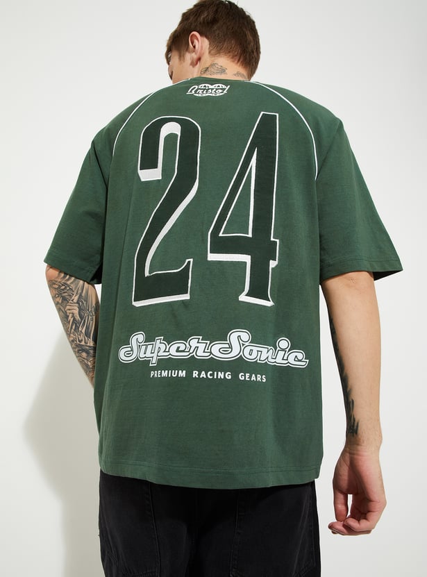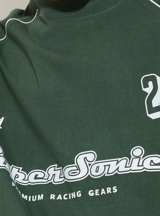 This T-shirt offers a bold and dynamic design with its oversized fit. It features a striking print on the front and back, adding a sporty edge. The crew neck and half sleeves ensure comfort and ease, while the fine detailing highlights its premium appeal.