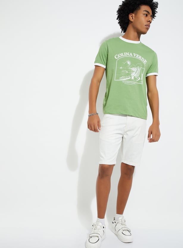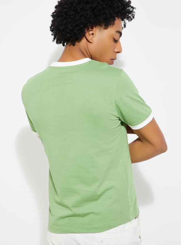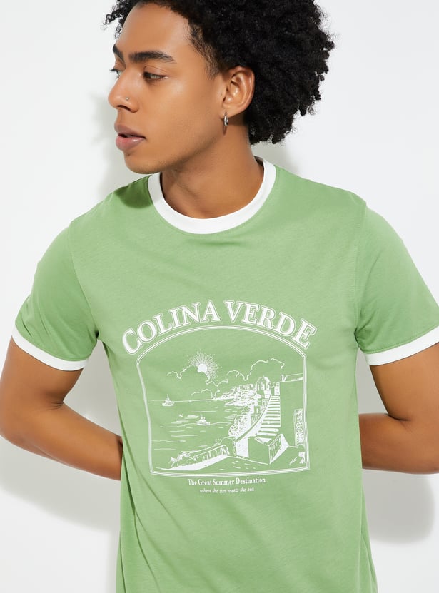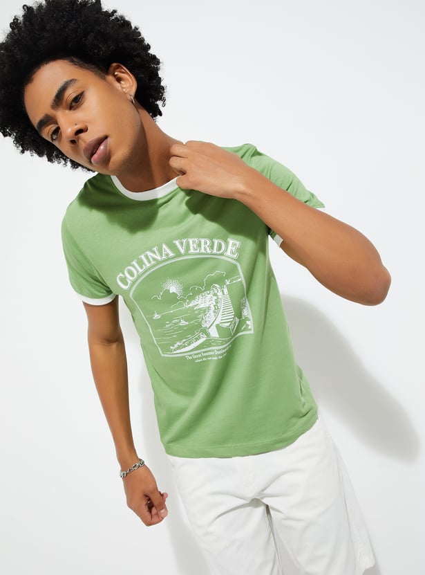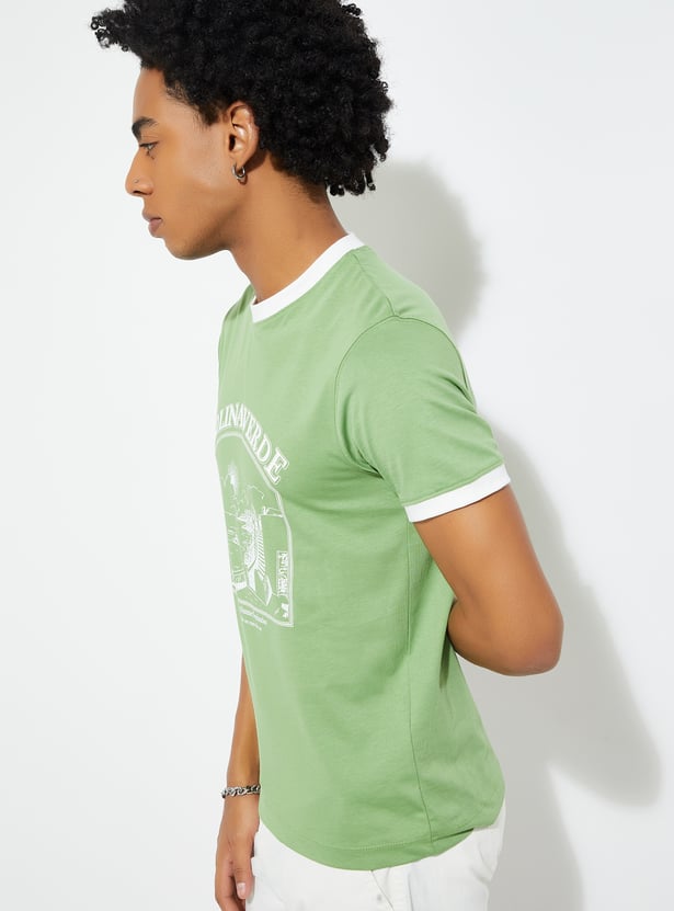 This printed T-shirt features a classic crew neck with contrast taping and half sleeves, offering a comfortable and stylish fit. The bold print adds personality, while the contrast taping enhances its sporty appeal.