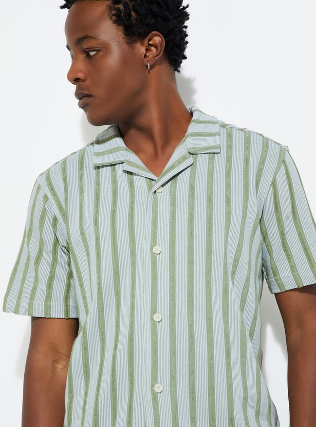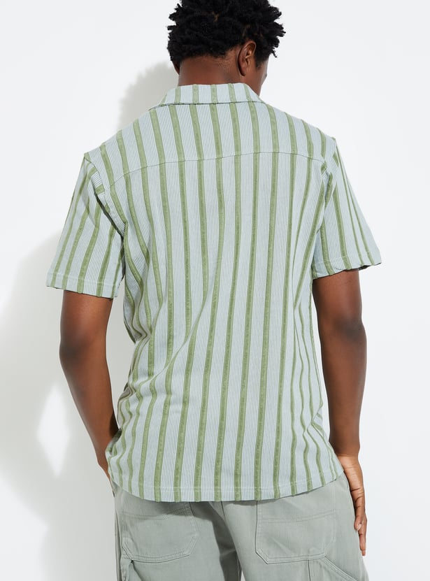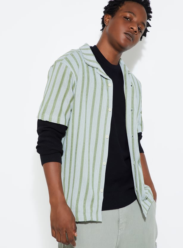 Level up your summer vibe with this striped shirt, featuring a resort collar, half sleeves and button placket. Perfect for urban adventures, it adds a touch of laid-back sophistication to your street style.