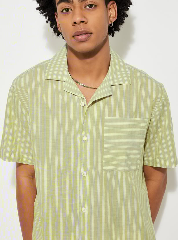 This oversized resort shirt features a stylish striped design with a relaxed resort collar and half sleeves for a cool, laid-back look. The button placket adds a touch of classic style, making it perfect for both casual outings and vacation vibes.