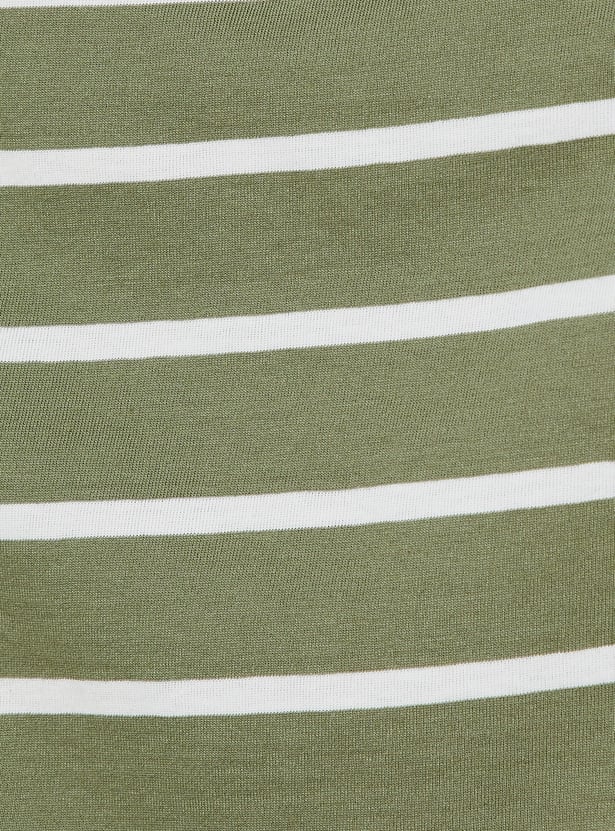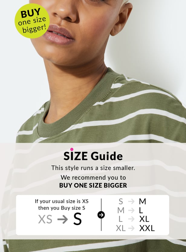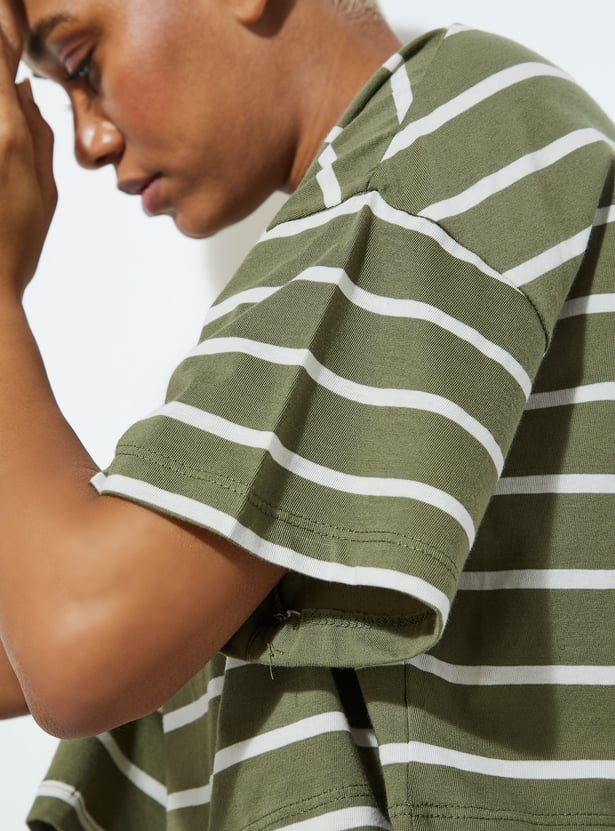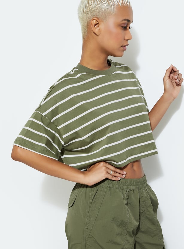 Elevate your street style with this T-shirt featuring a striped cropped silhouette and boxy fit. Complete with a classic round neck and half sleeves for a trendy yet comfortable look.