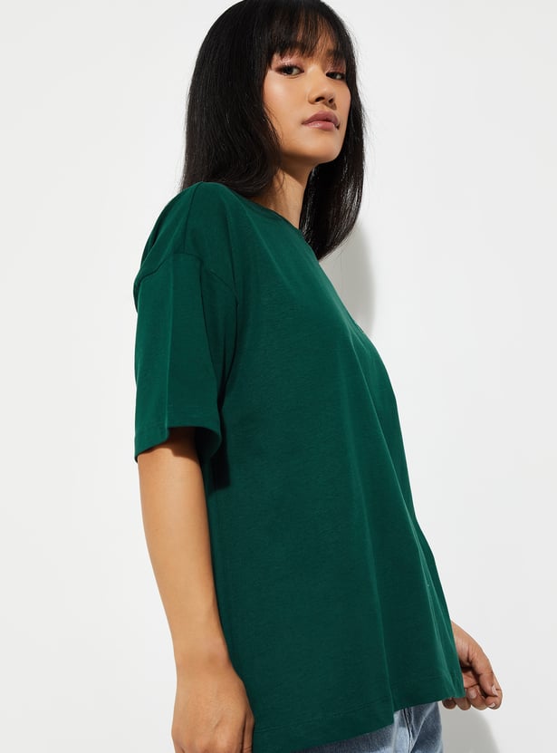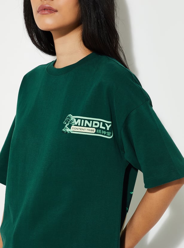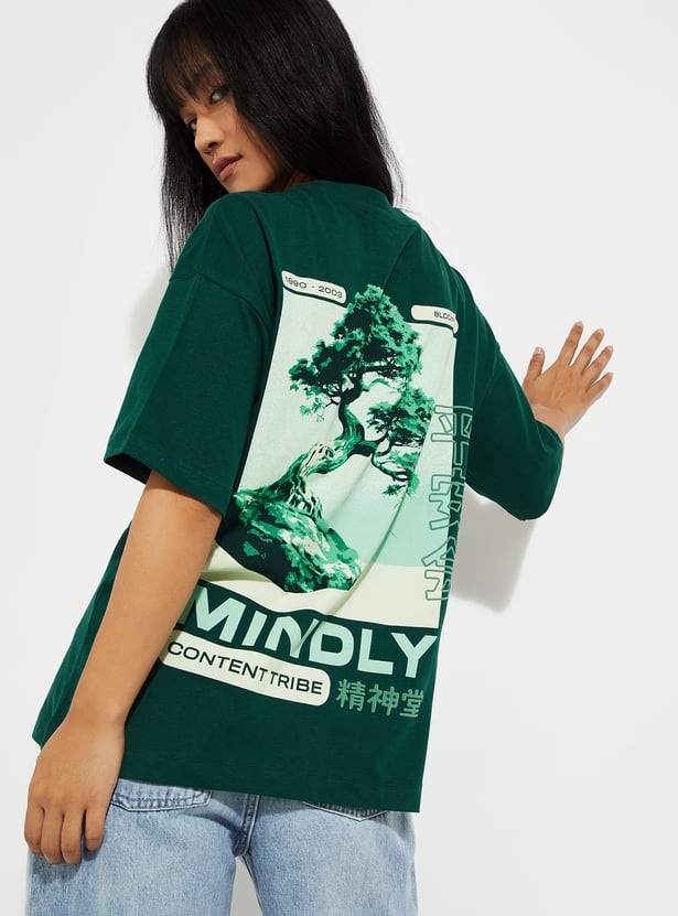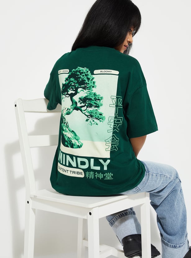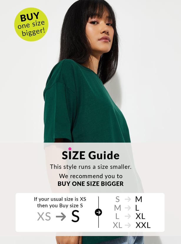 Make a statement with this graphic print oversized t-shirt, featuring a round neck and half sleeves. Designed for a relaxed fit, it combines comfort with bold, casual style perfect for everyday wear. Model Size :
