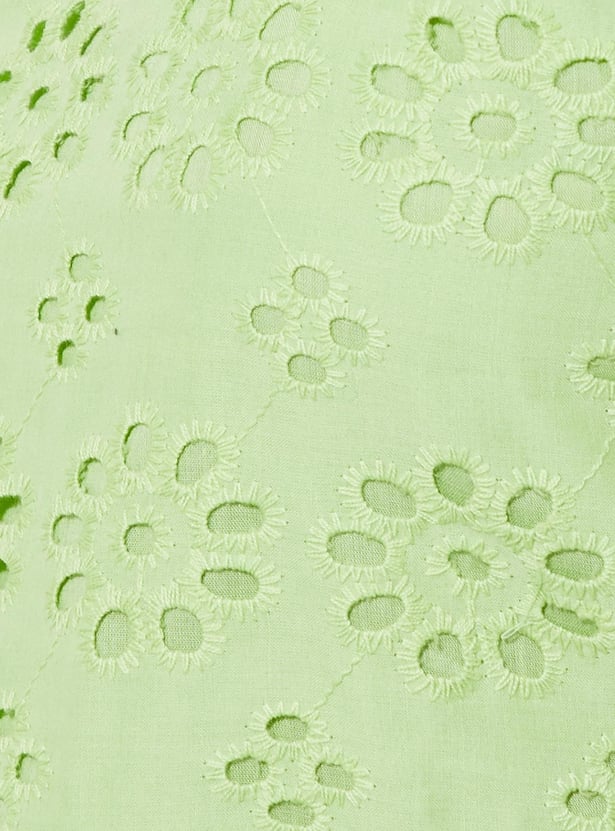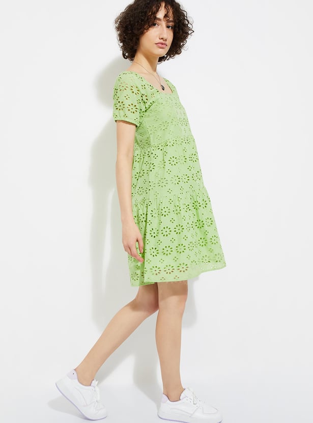 Channel boho vibes with this enchanting dress featuring schiffli embroidery, an A-line silhouette, a square neck, half sleeves, a tie-up back and a tiered profile.