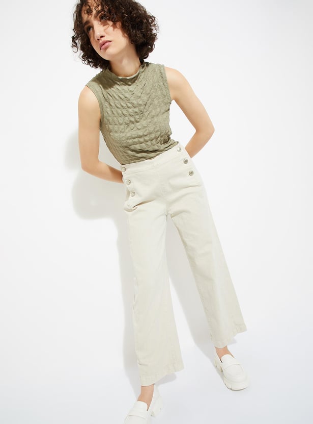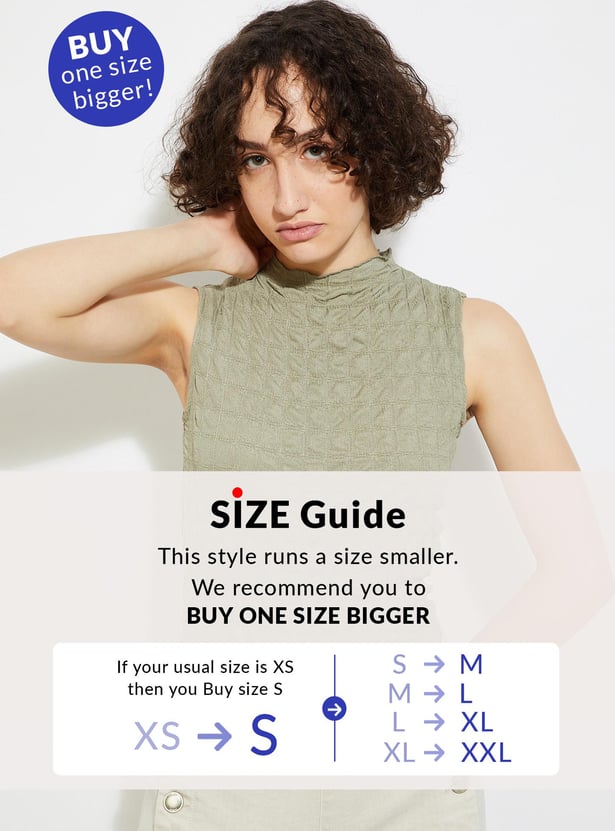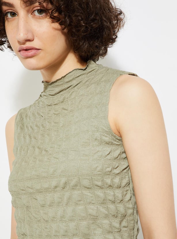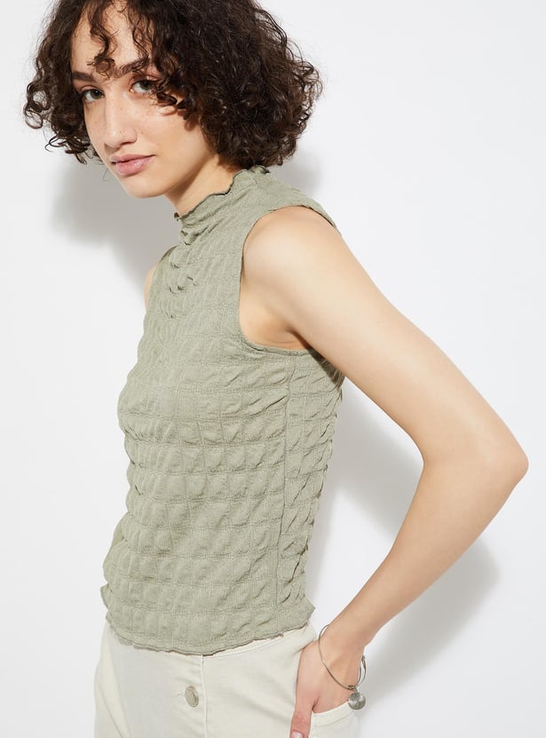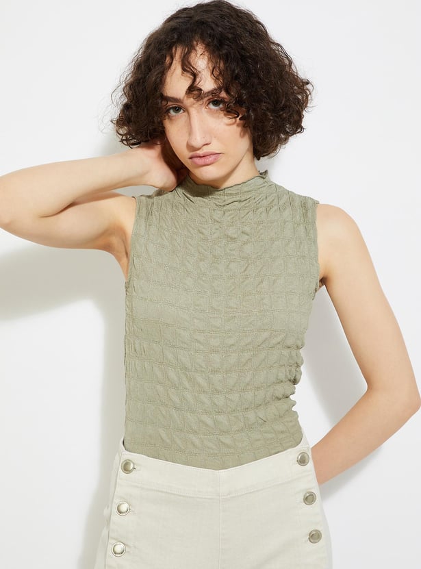 Take your casual look to the next level with this top boasting a chic textured surface. Featuring a sleek high neckline and a flattering sleeveless silhouette, it's the perfect blend of style and comfort.