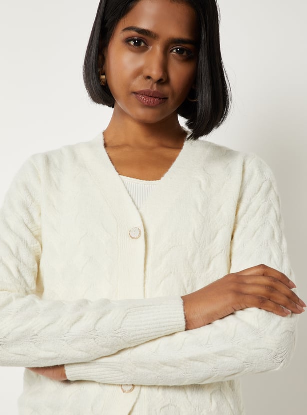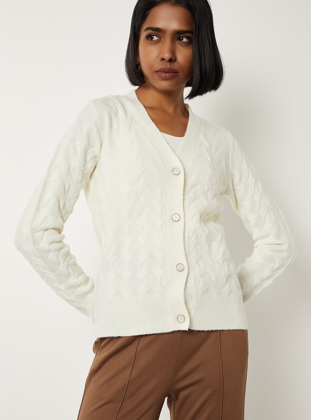 Classic and cozy, this cable knit cardigan features a flattering V-neck, full sleeves, and a front button placket. The textured knit adds warmth and charm, making it a layering essential for cooler days.