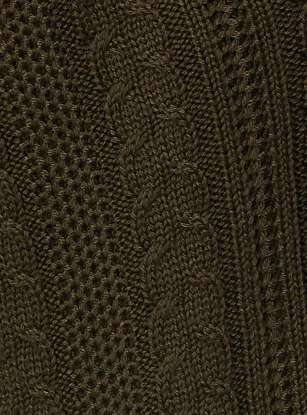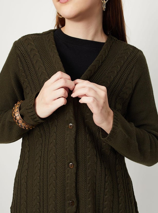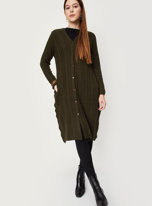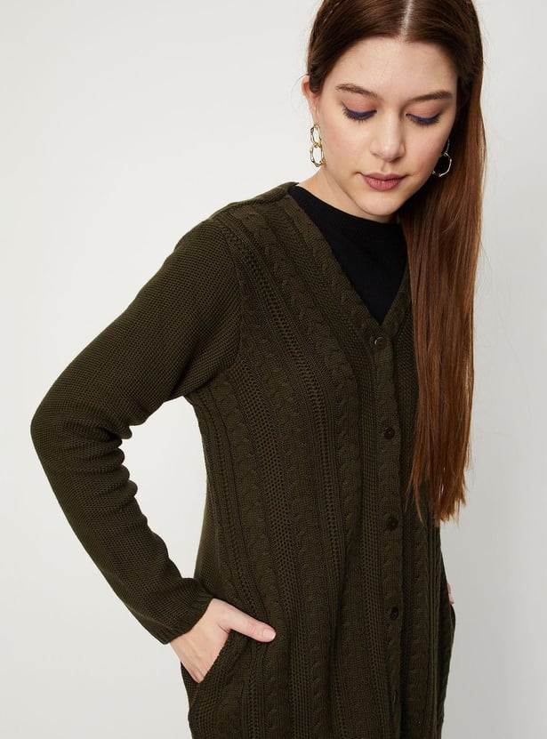 Cosy up for the season in this longline cardigan highlighted with a cable knit pattern. It is designed with a V-neck, long sleeves, button-front closure, and waist pockets. Layer this cardigan over a top and team it up with treggings and ankle boots.