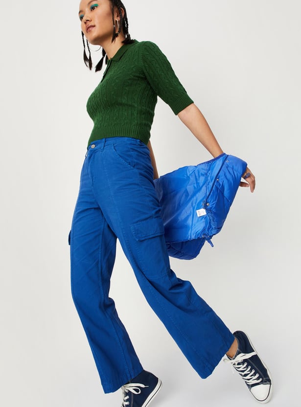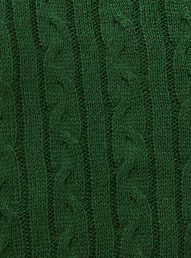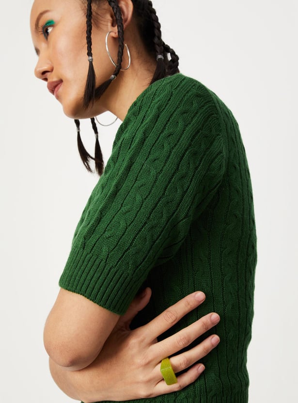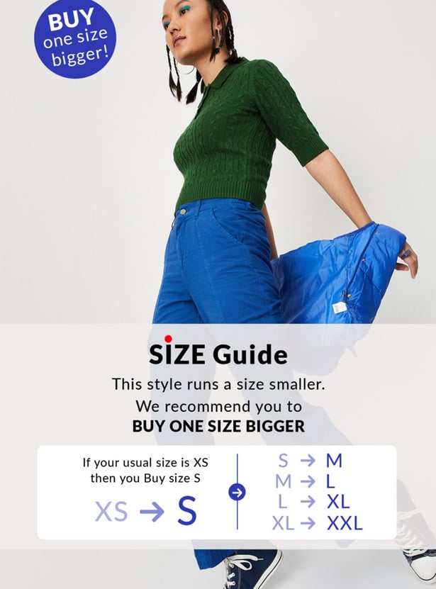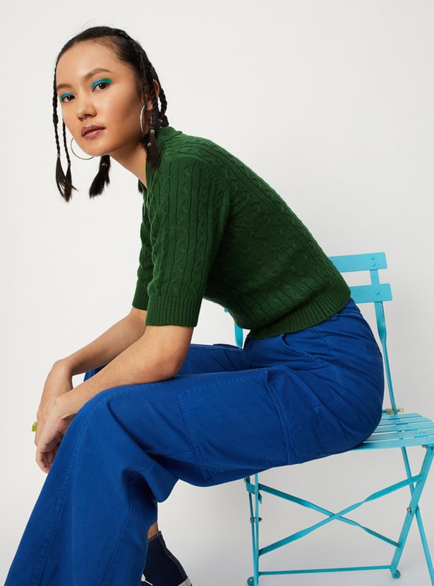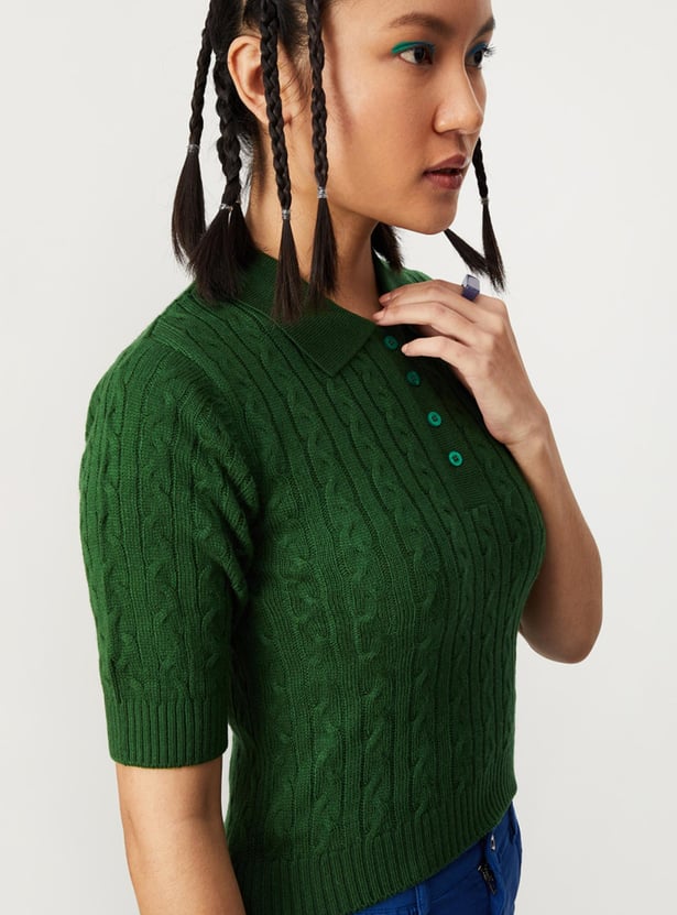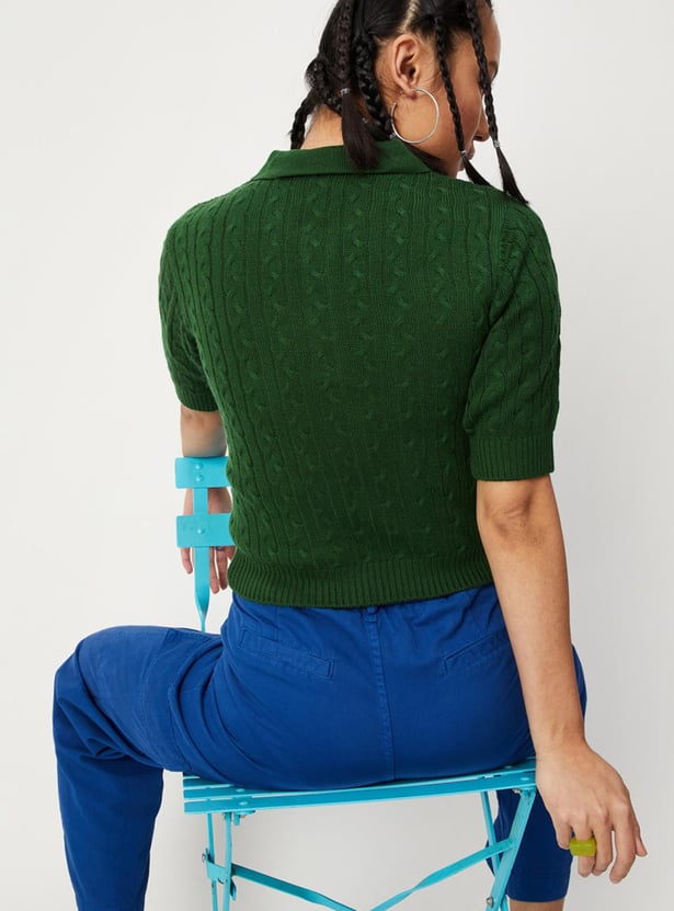 Up your winter wardrobe game with this snuggly cable knit sweater top. It is fashioned with a polo collar, short sleeves, and ribbed trim. Complete the cosy look by teaming up this top with cargo pants and sneakers.