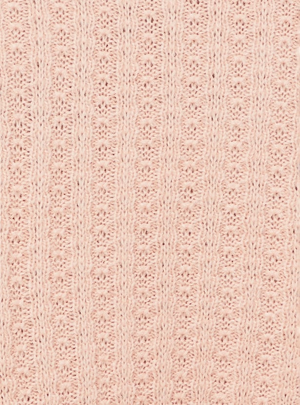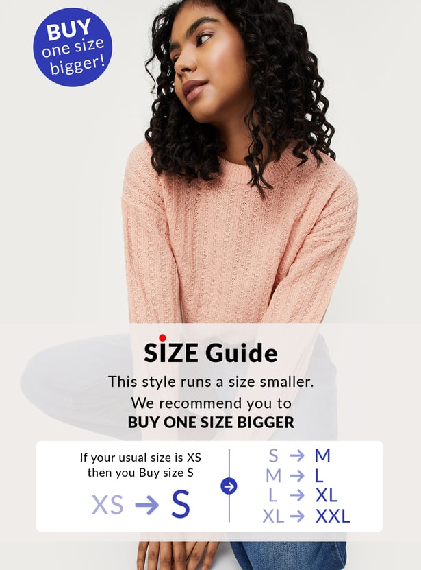 Upgrade your winter wardrobe with this elegant cable knit cropped sweater. It features a round neck, full sleeves, and a ribbed hem, keeping you warm and fashionable throughout the season.