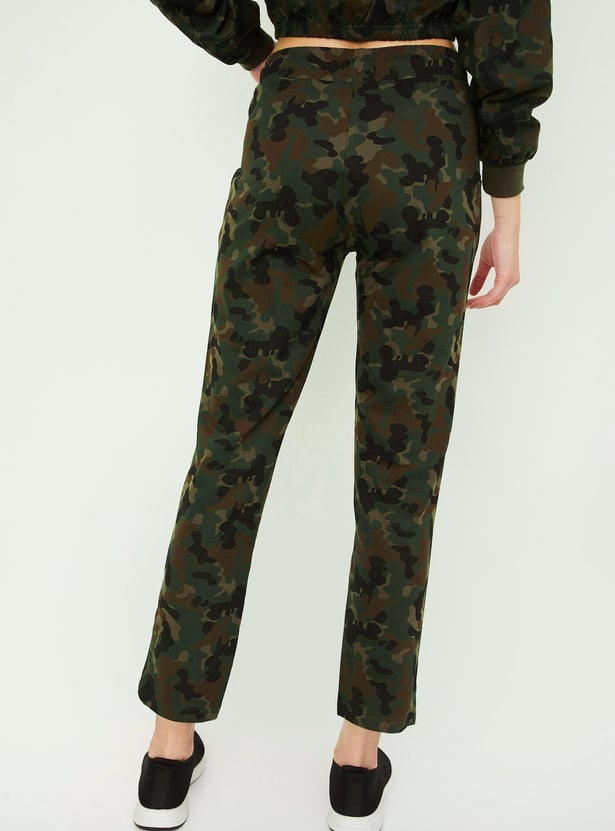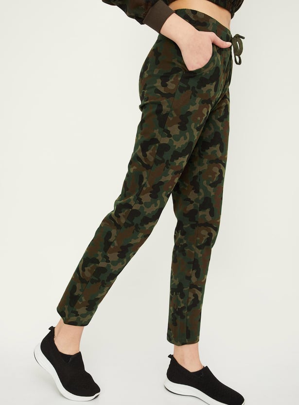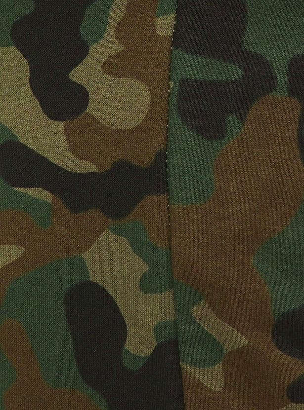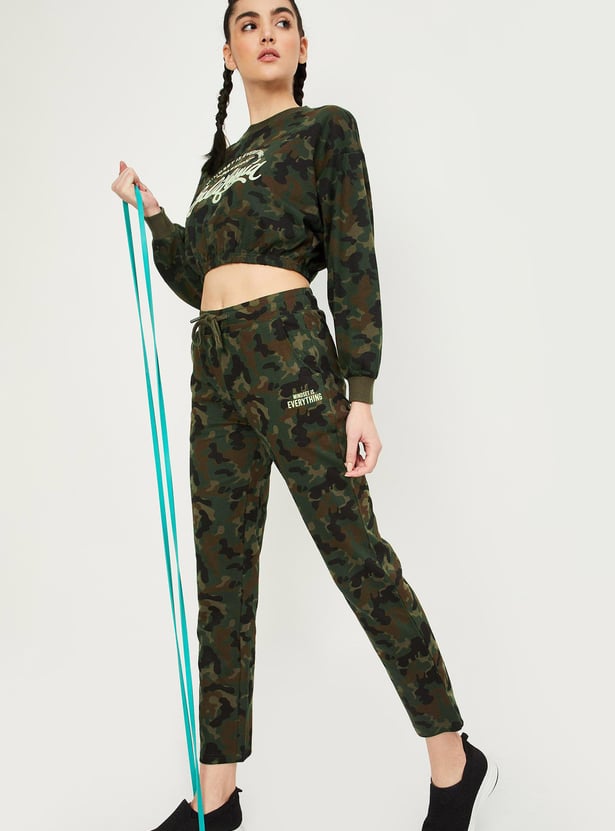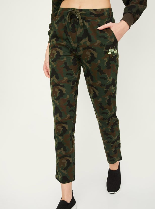 Lift your workout attire with these stylish camo track pants. They have an elasticated waist with drawstrings, side pockets, and an inspirational typographic print detail on the front. An all-over printed pattern and regular fit make it a perfect choice to keep your style fresh.