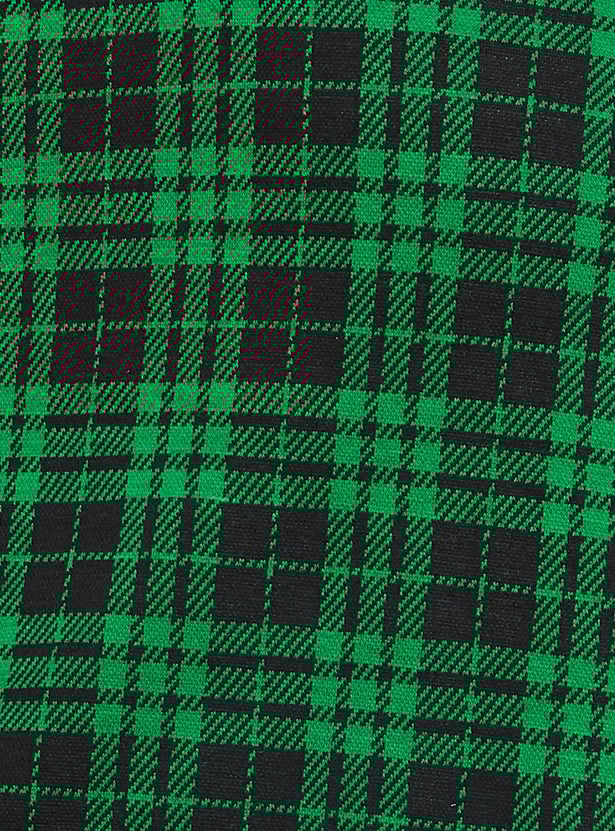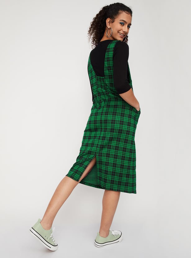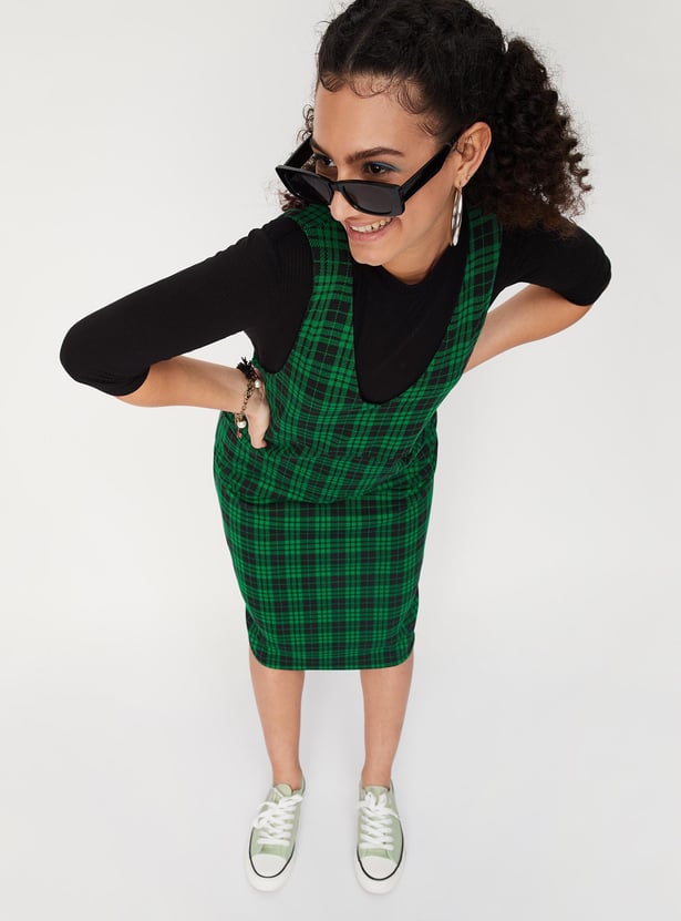 Updated with classic checked pattern, this midi-length pinafore dress is styled with a V-neckline, sleeveless profile, and waist pockets. It includes a ribbed top featuring a high neckline and three-quarter sleeves.