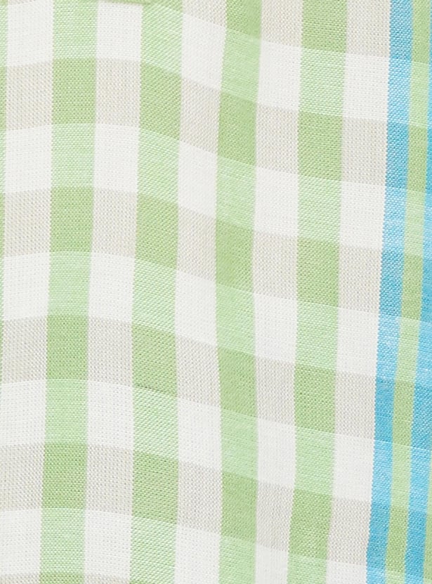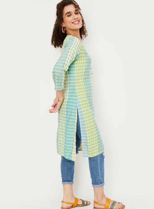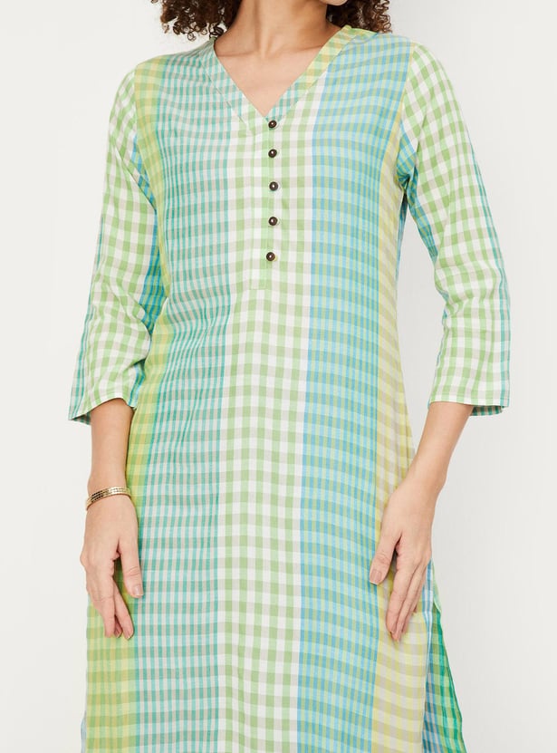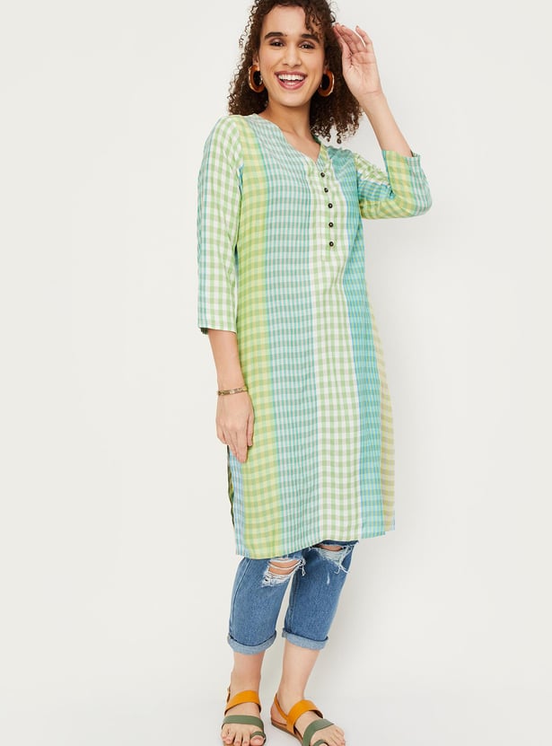 Dress up with this straight kurta with a checked design, a V-neck, three-quarter sleeves, and knee-length construction. Team this kurta with a pair of leggings and sandals to make your outfit look complete and elegant.