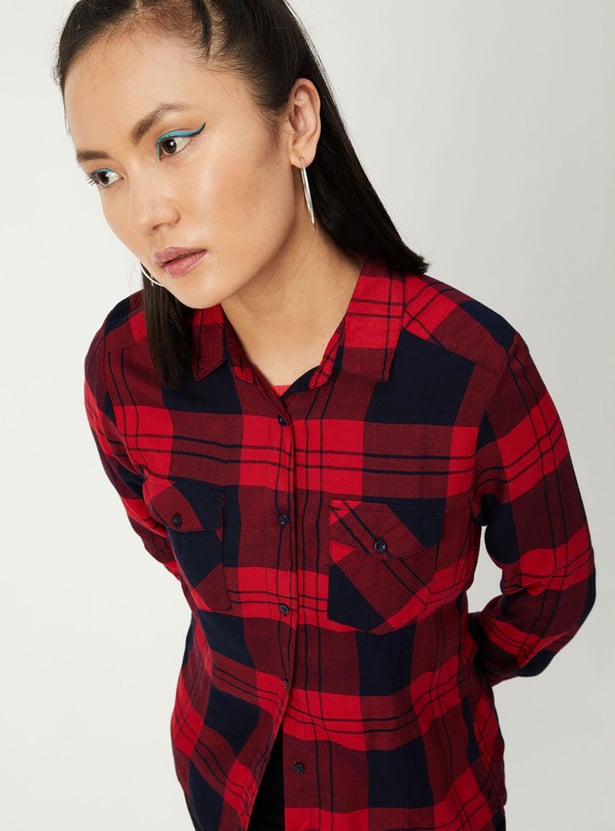Whether you like simple, bold, or classic, this shirt is a must-have in your wardrobe. It is tailored with a spread collar, long sleeves with buttoned cuffs, flap pockets at the chest, a curved hem, and a checked pattern. For an elevated look, layer this shirt over a crop top and team it up with jeans, sneakers, and sunglasses.