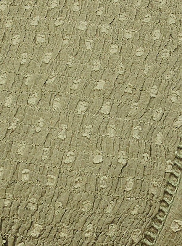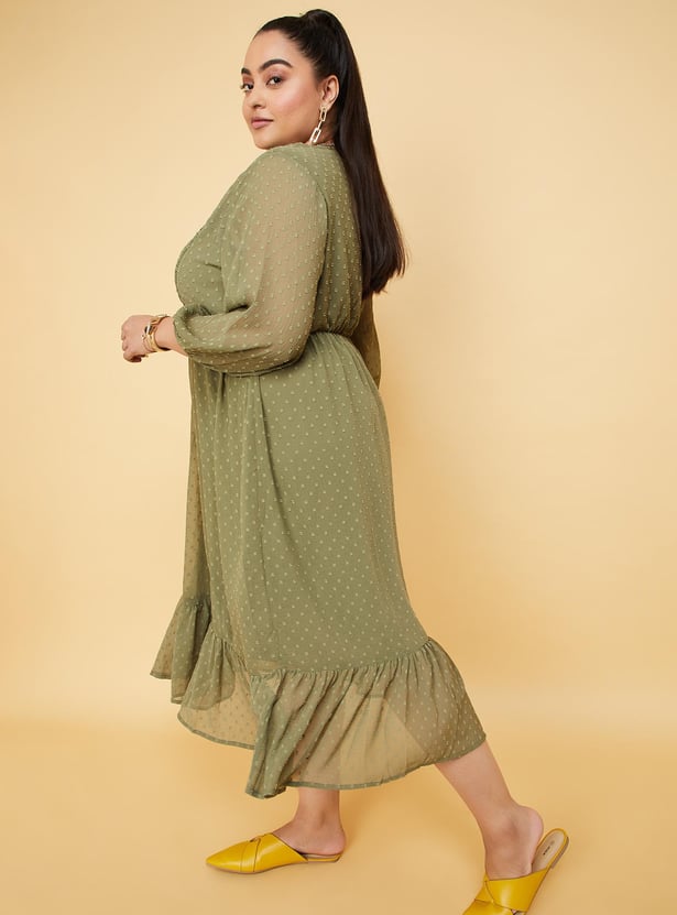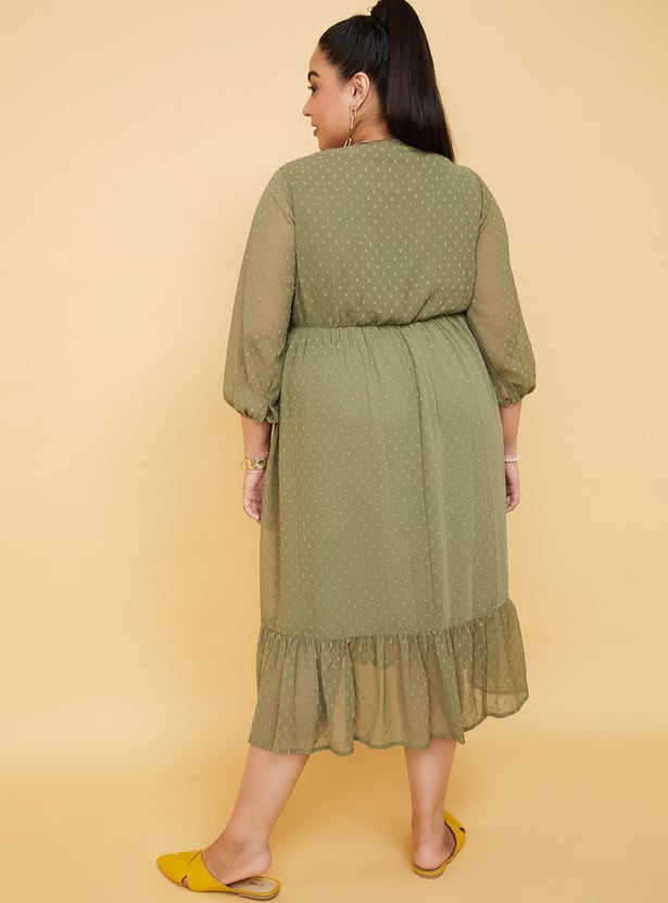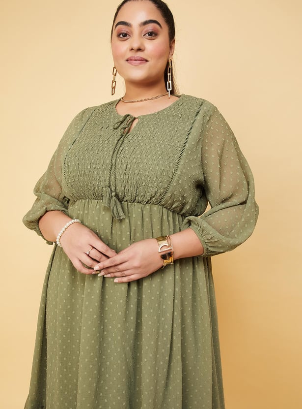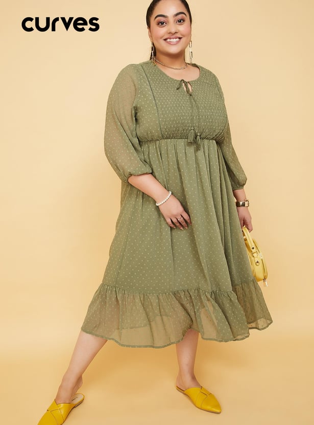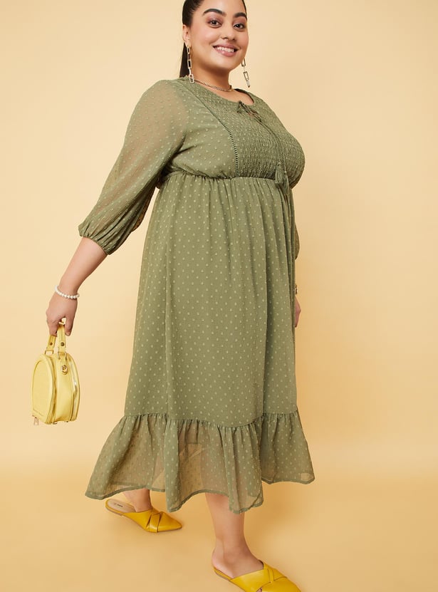 Breeze through the day in style in this midi-length dress. It is highlighted with a woven design and a smocked yoke for a flattering look. This dress has a tie-up neck, three-quarter sleeves, cinched waist, and a ruffled hem.