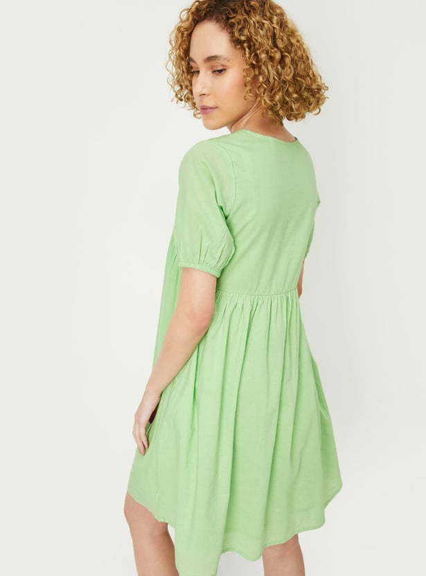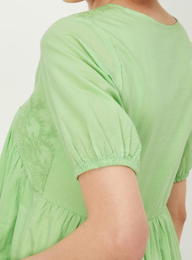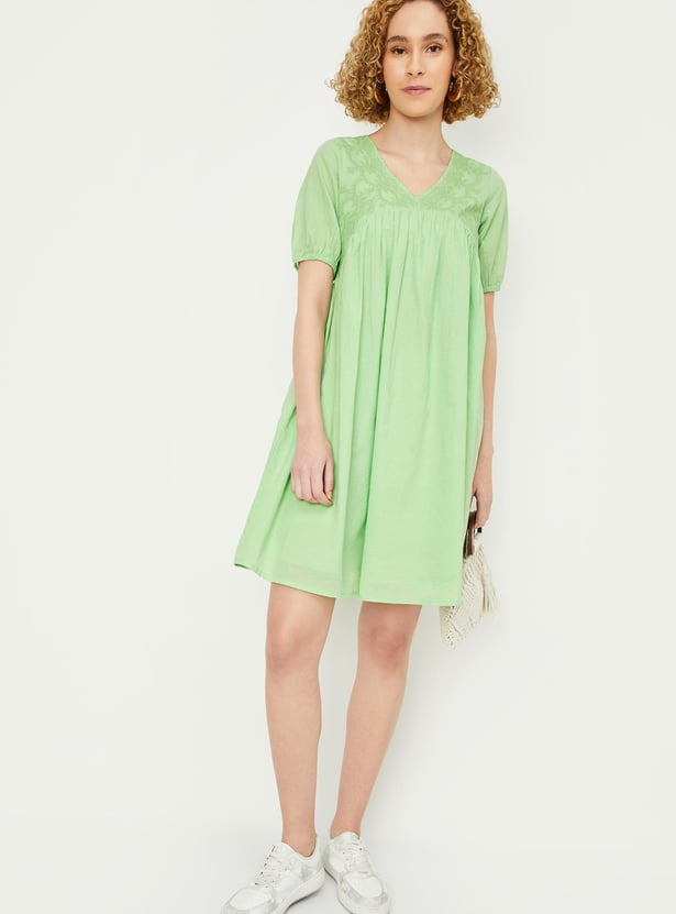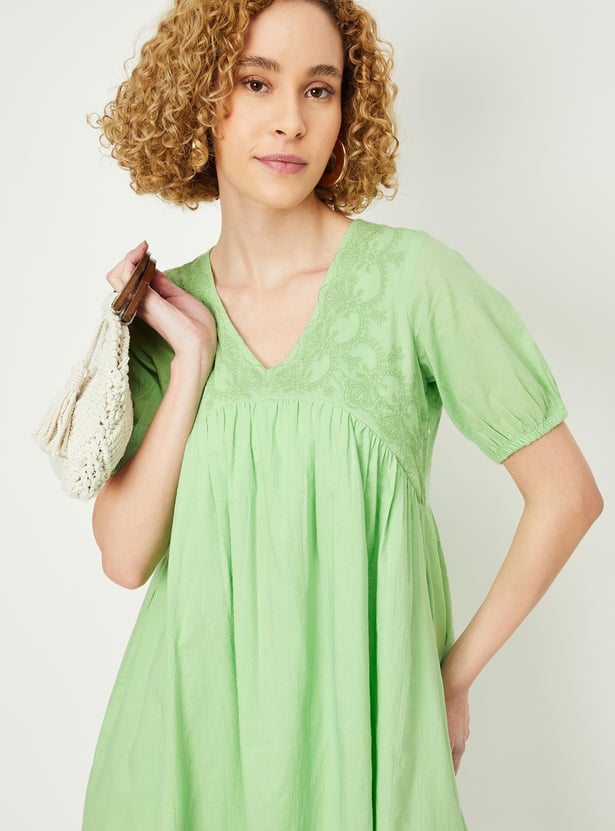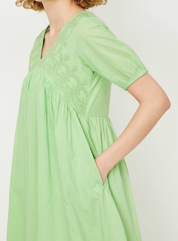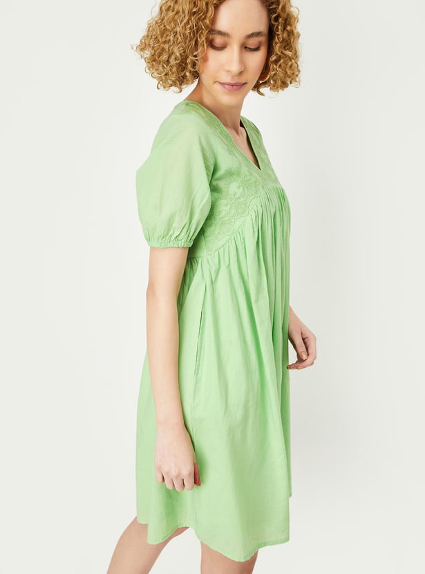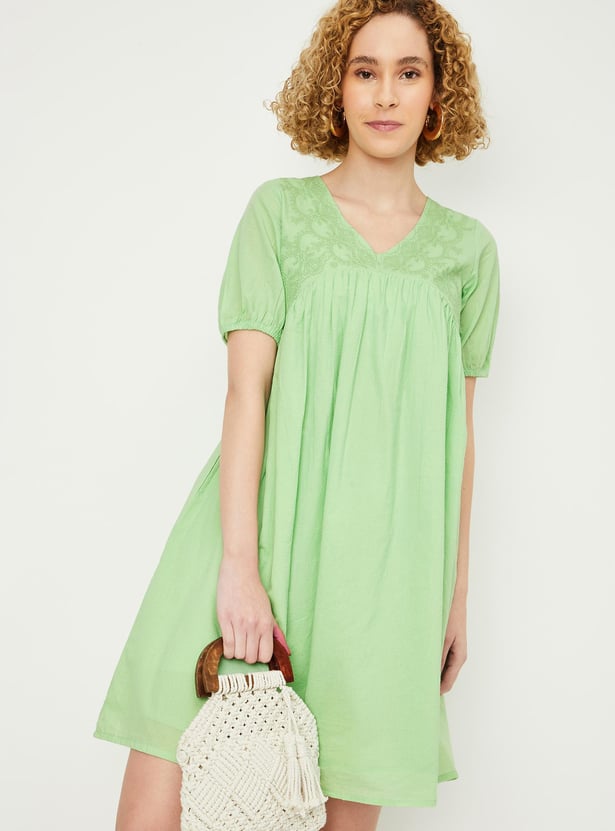 This gorgeous dress with a fascinating embroidery design makes your style more charming. With a delightful v-neckline, puff sleeves, side pockets, and an A-line silhouette.