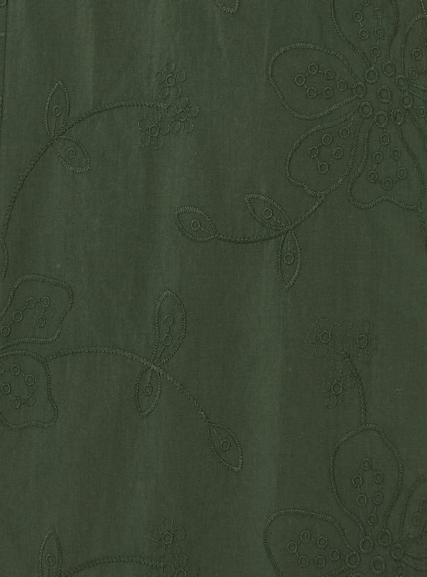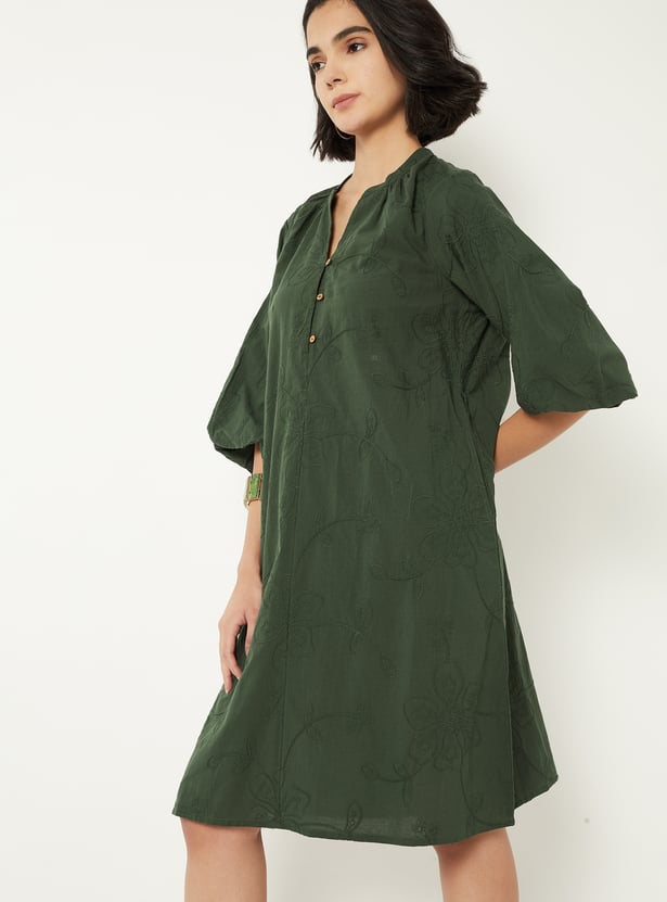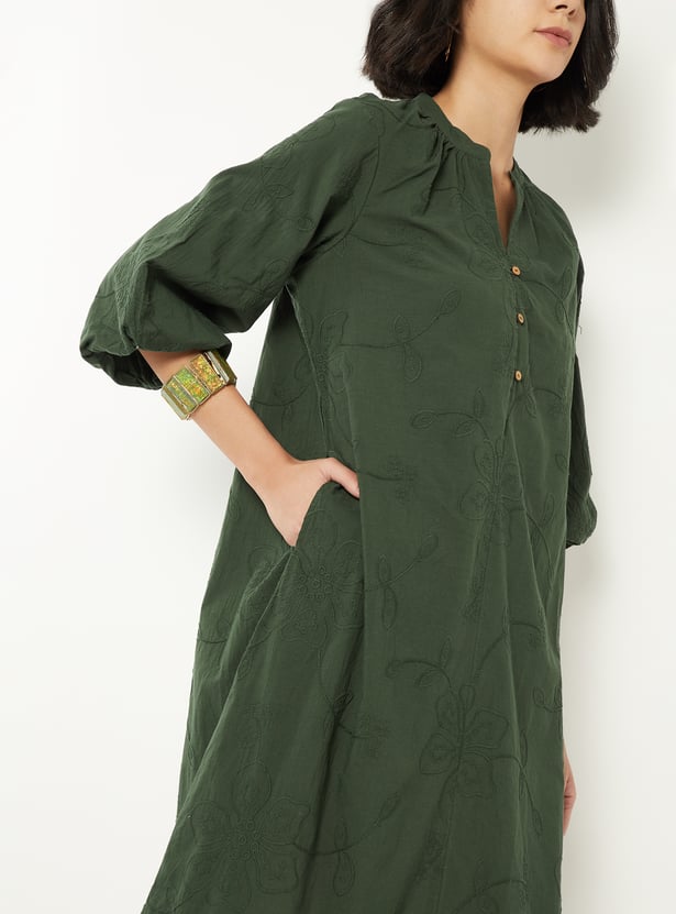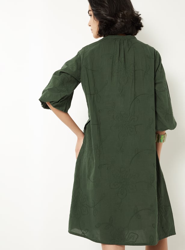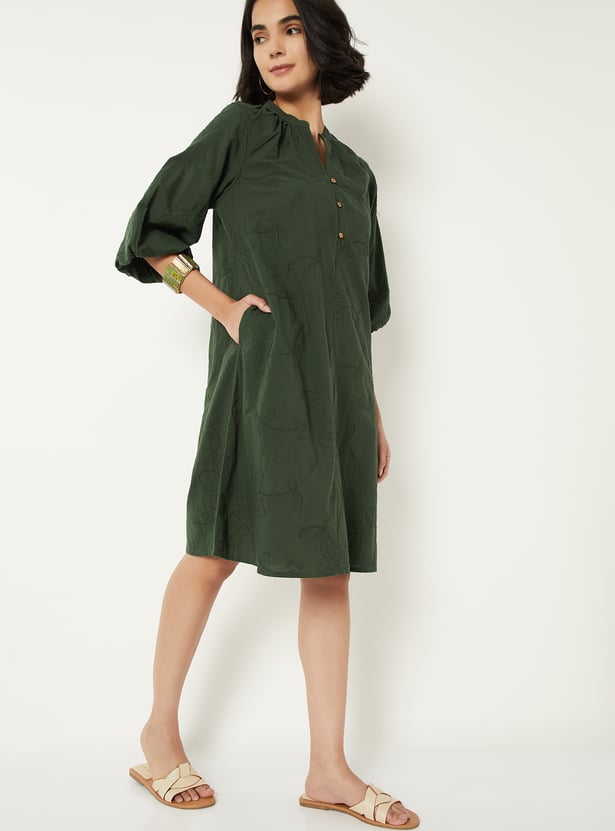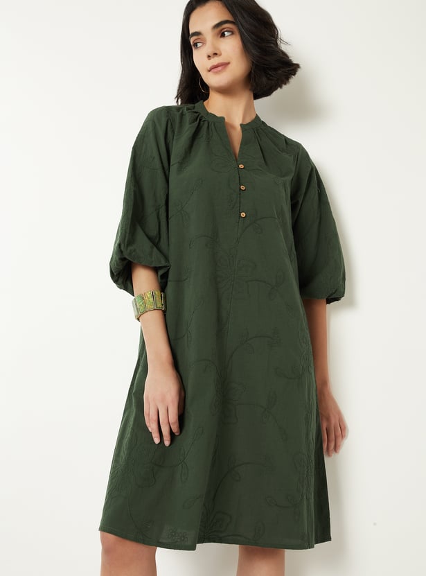 Embrace timeless elegance with this embroidered A-line dress, designed at knee length with a refined band collar and 3/4th balloon sleeves. Its graceful silhouette and intricate detailing make it a versatile piece.