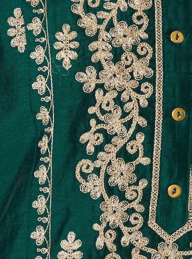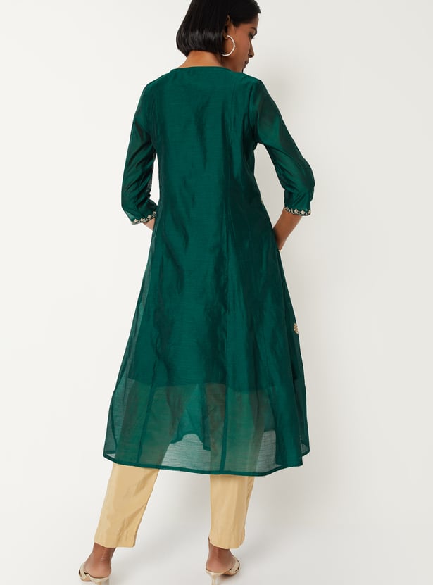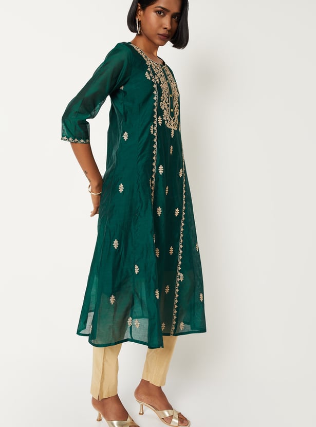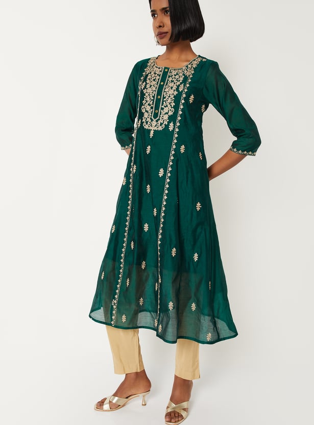 Elevate your ethnic wardrobe with this embroidered A-line kurta. Designed with a round neck and 3/4th sleeves, it blends traditional charm with effortless elegance, making it perfect for festive occasions or everyday wear.