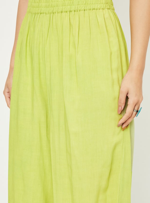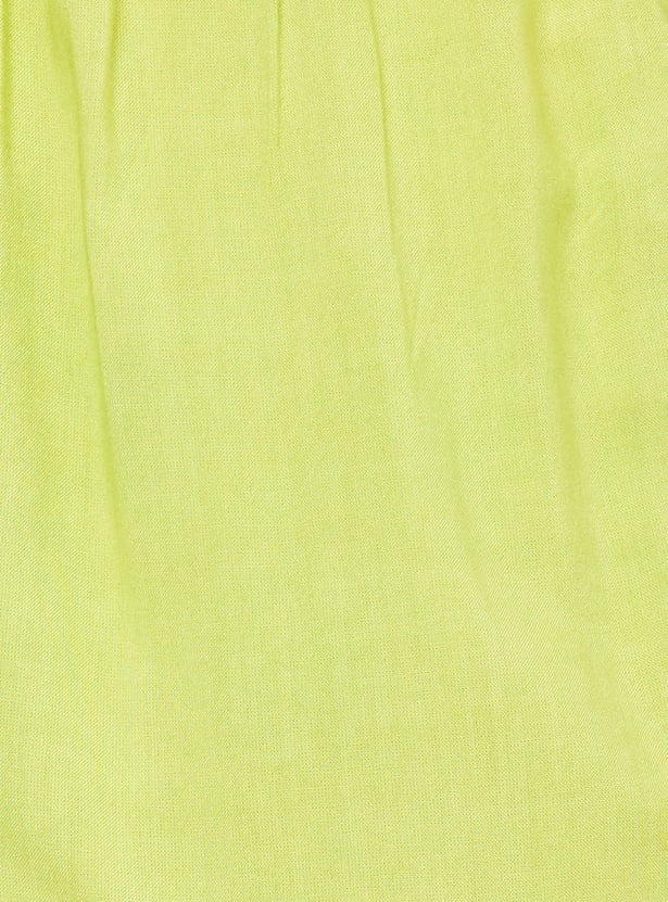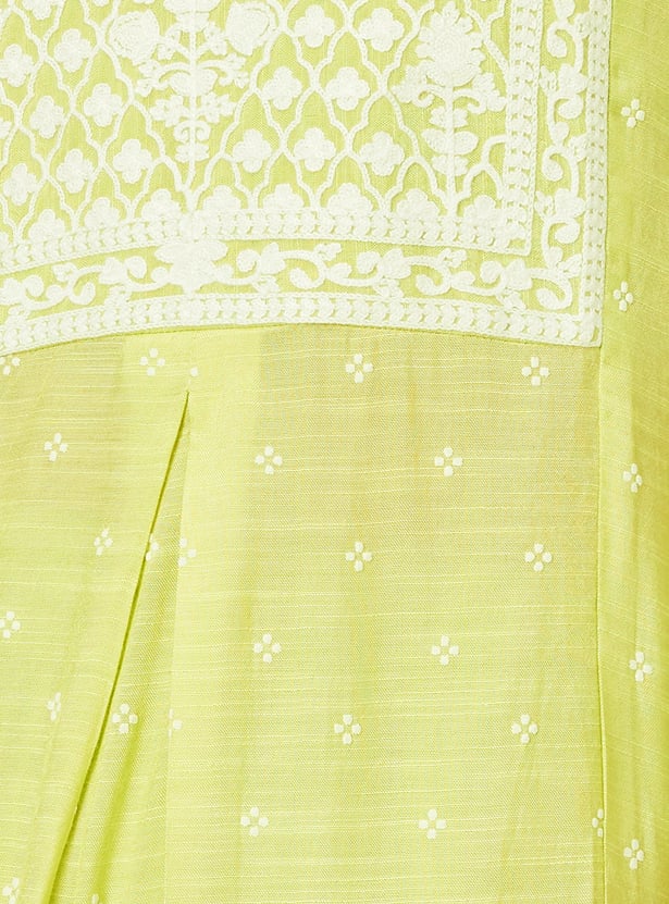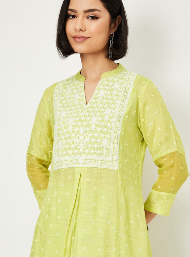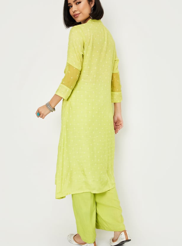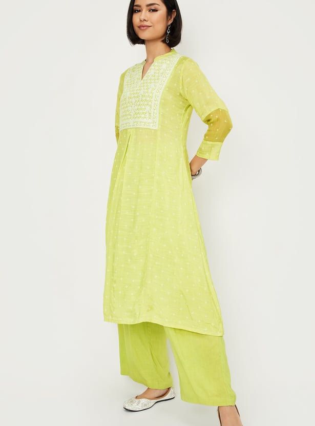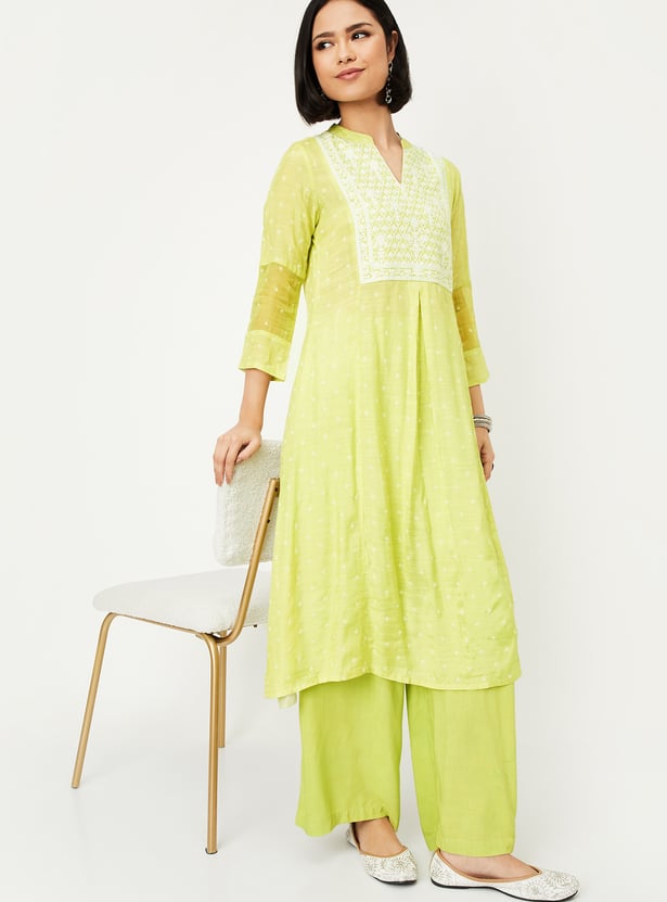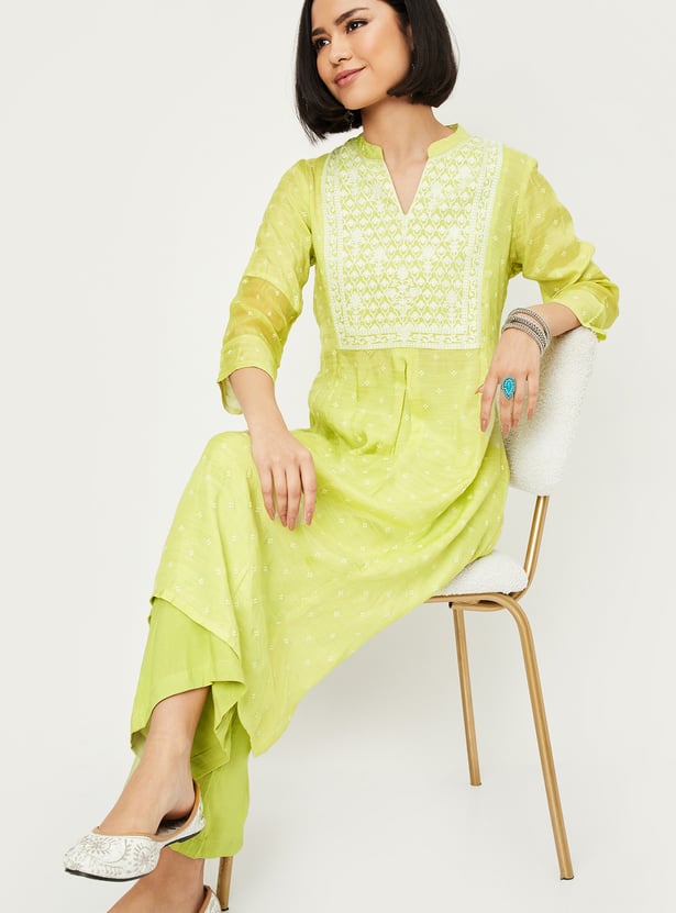 This embroidered kurta set features a a-line kurta with a v-neckline, side pockets, and 3/4th sleeves for a blend of style and functionality. It is paired with solid straight pants with an elasticated waist, ensuring comfort and a coordinated look.