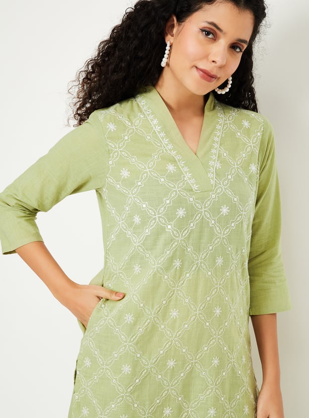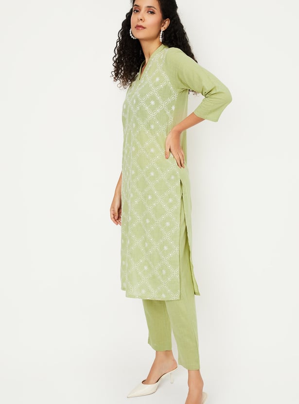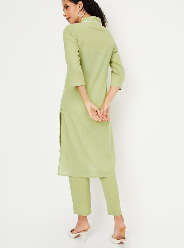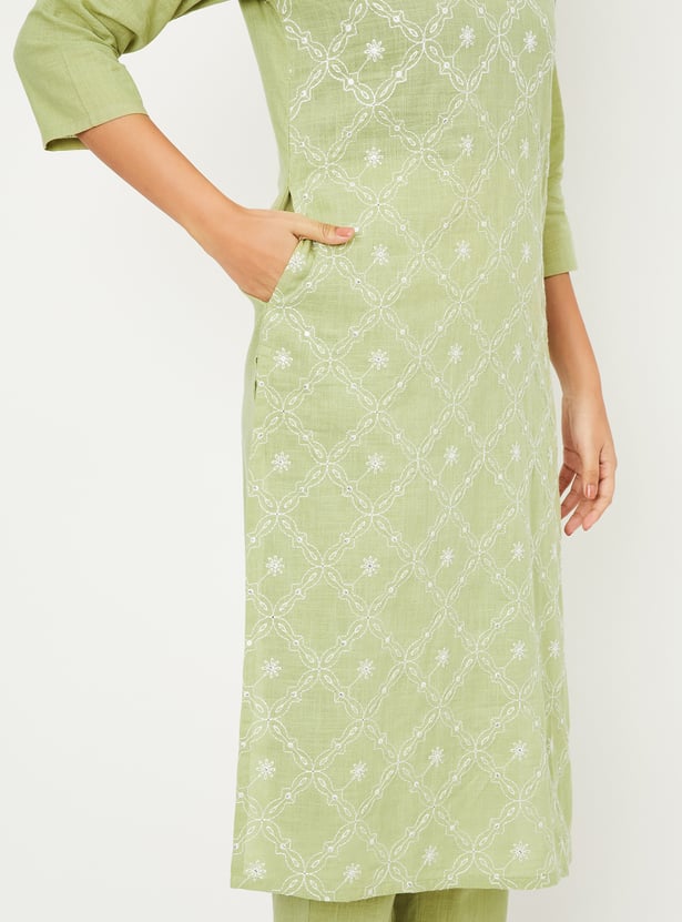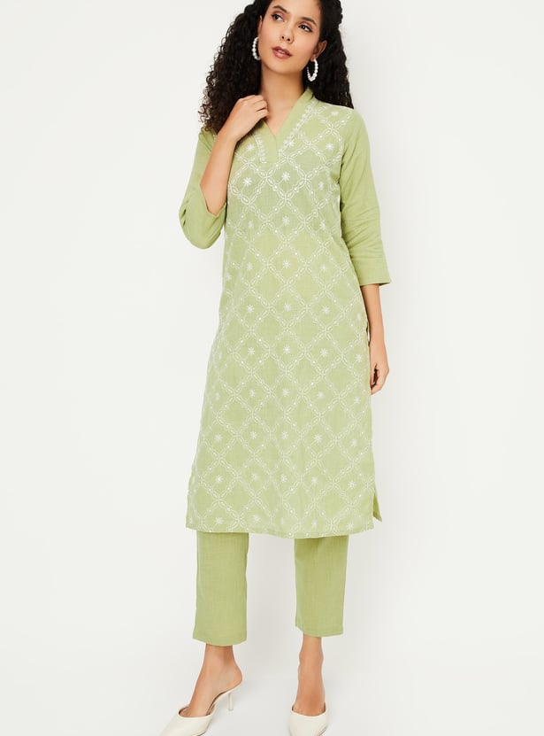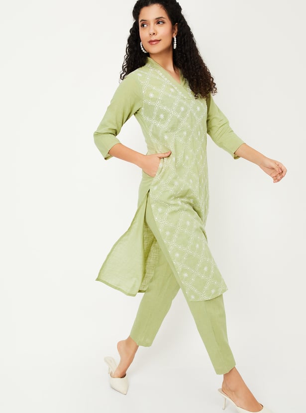 Discover timeless elegance with this embroidered straight kurta set. Featuring a v neck, side pocket, and side slits, the kurta offers both style and functionality. Paired with elasticated waist straight pants, it ensures comfort with a graceful finish.