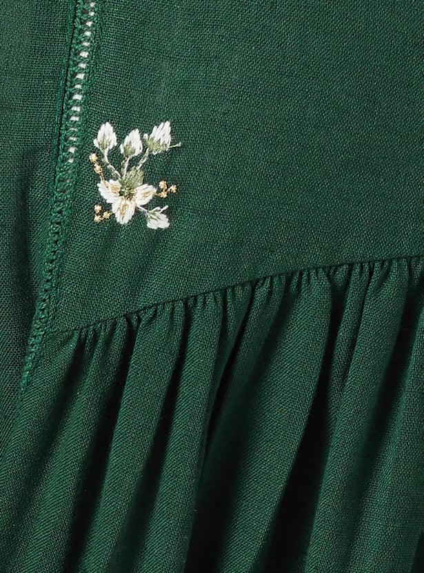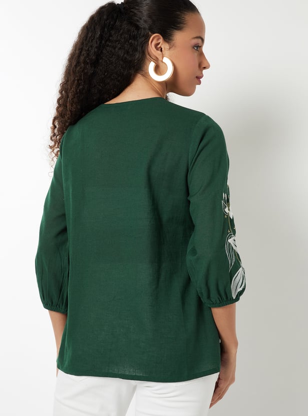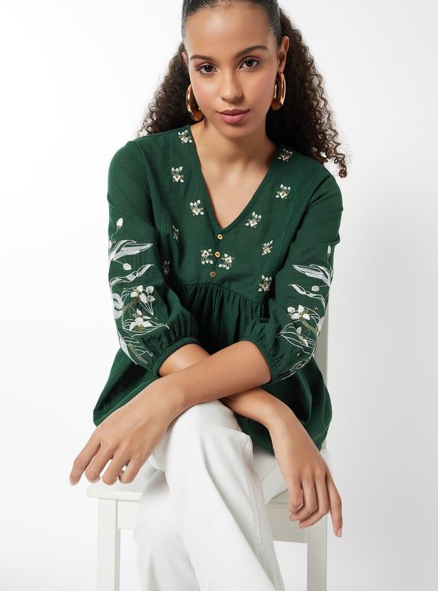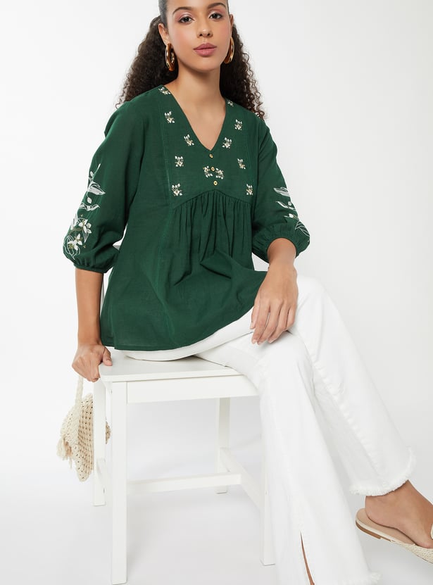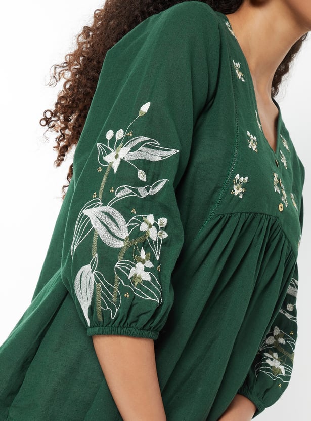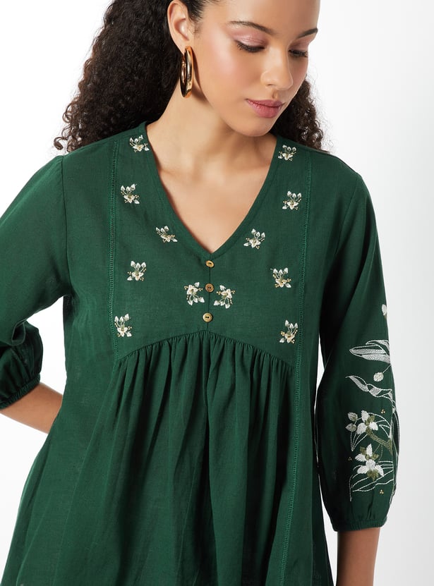 Add easy elegance to your everyday look with this embroidered A-line tunic, designed for comfort and style. It features a flattering v-neck and 3/4th sleeves, perfect for versatile, all-day wear.