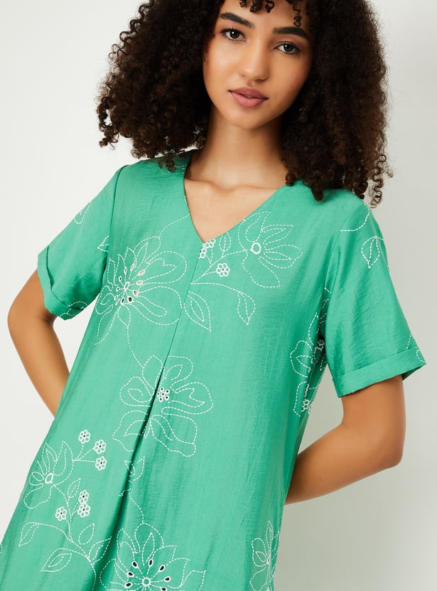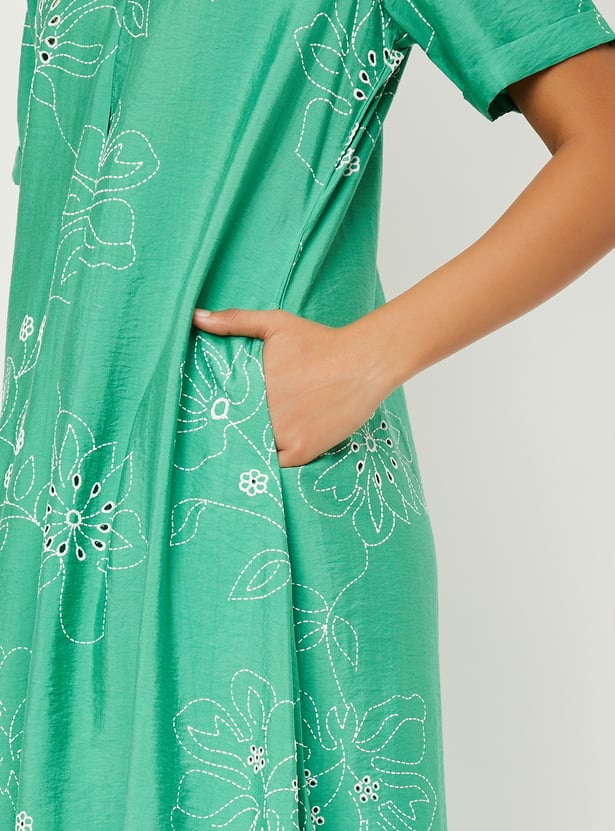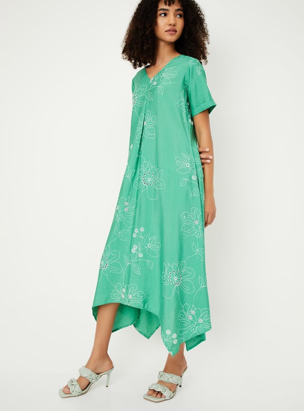 Make a graceful statement with this embroidered A-line dress. Featuring a flattering V-neck, half sleeves, and an eye-catching asymmetric hem, it blends elegance with a modern twist—perfect for special occasions or elevated everyday wear.