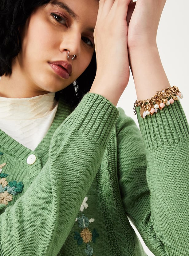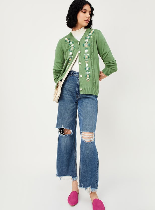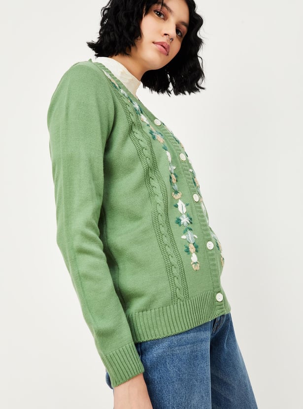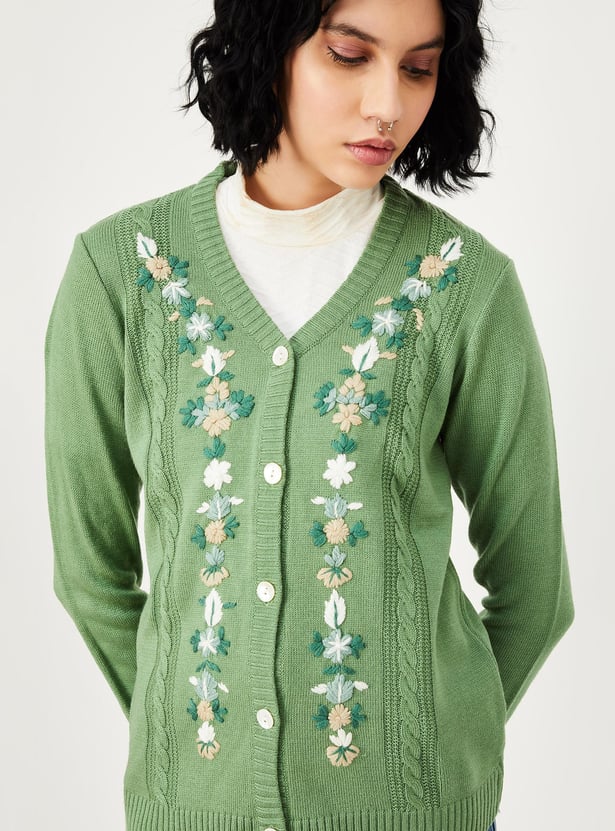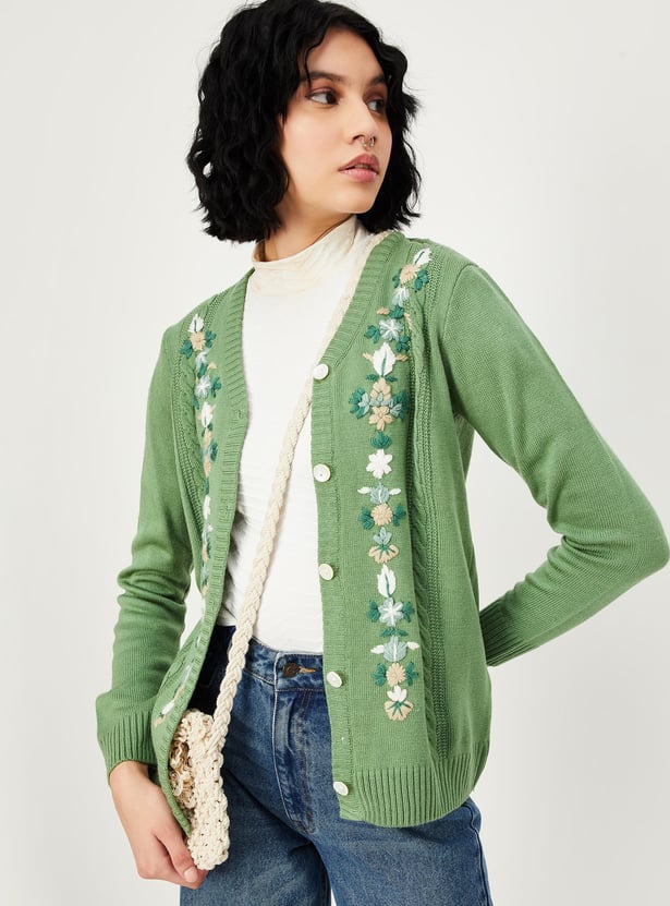 Upgrade your casual style this season with this cosy cardigan. Boasting a knit design, ribbed trim, and charming multi-tone floral embroidery, this cardigan adds a cute and fashionable touch to your look. With a V-neck, full sleeves, and a front button placket, it's perfect for layering over a tee.
