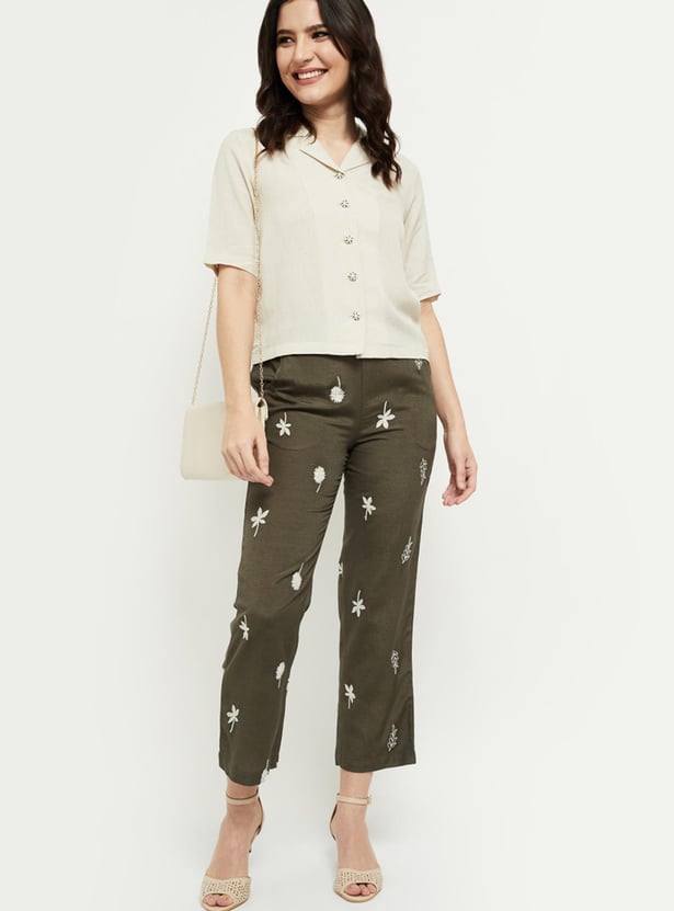 An ideal pick for a casual occasion, this pair of straight pants are designed with floral embroideries, elastic waistband, and insert pockets.