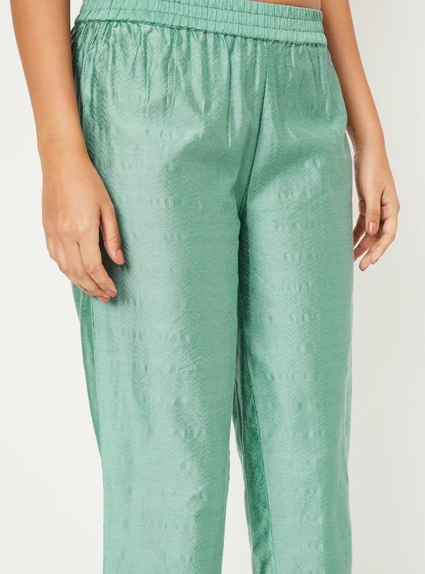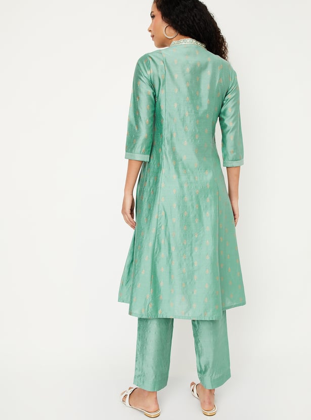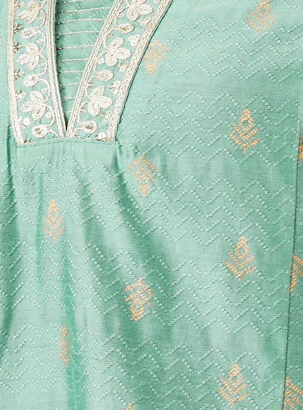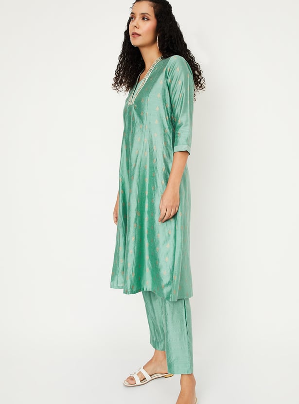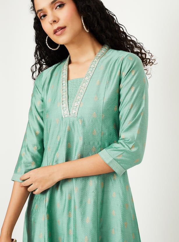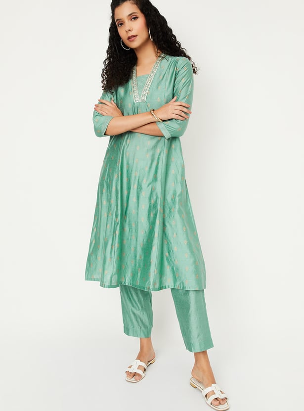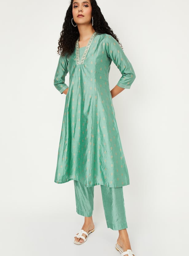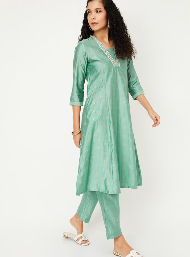 Grace meets tradition in this beautifully embroidered Kalidar kurta featuring a flattering V-neck and 3/4th sleeves. It’s paired with straight-cut pants with an elasticated waistband, offering comfort without compromising on elegance.