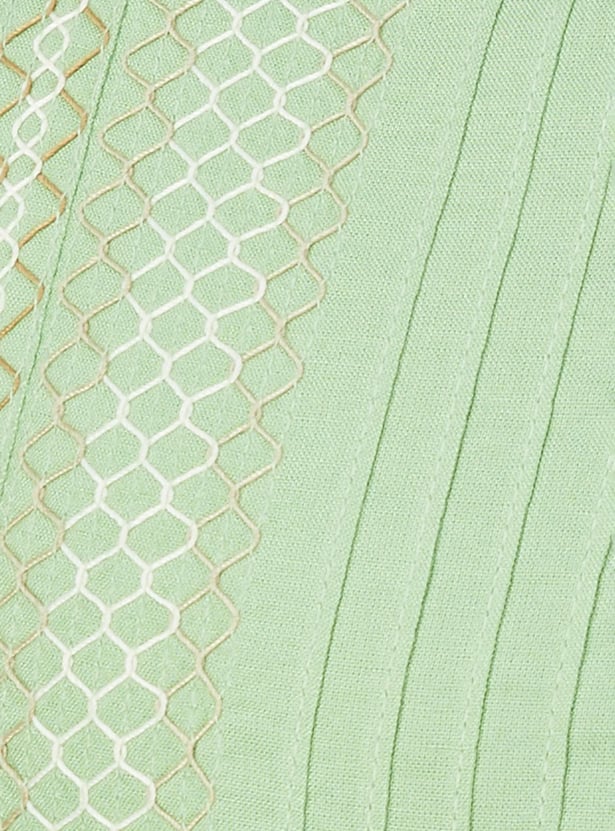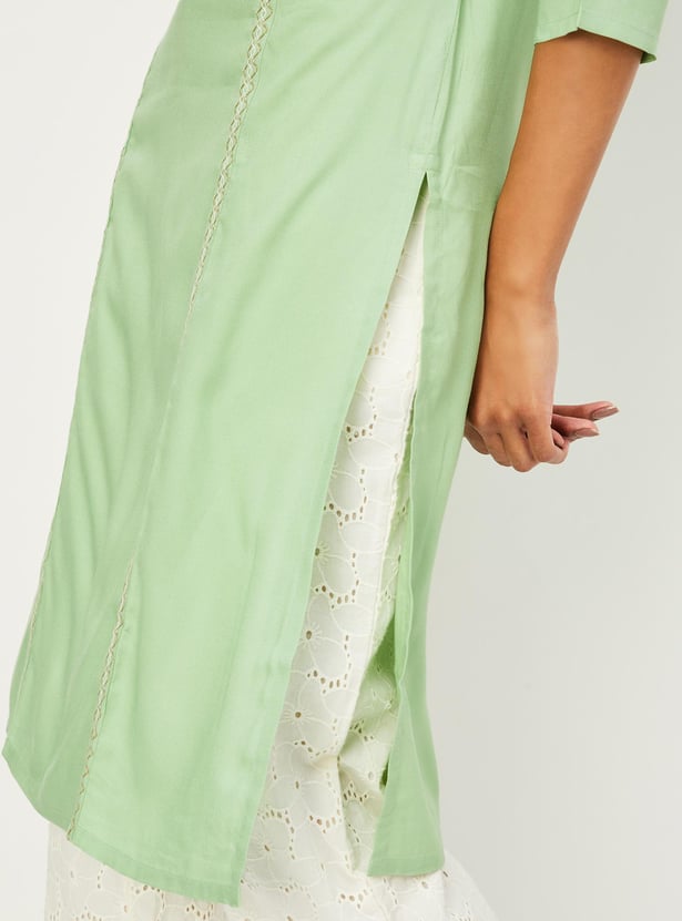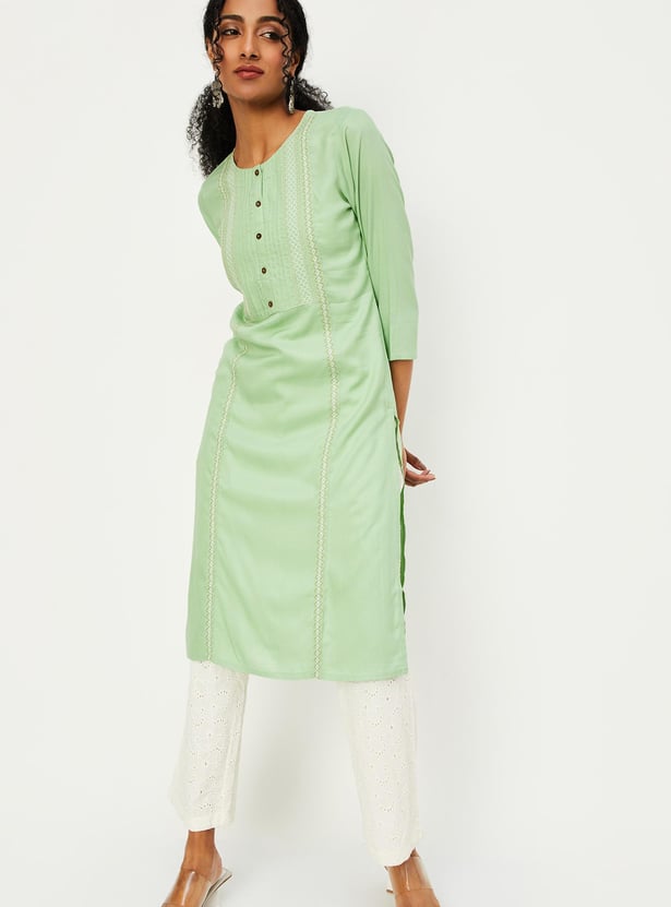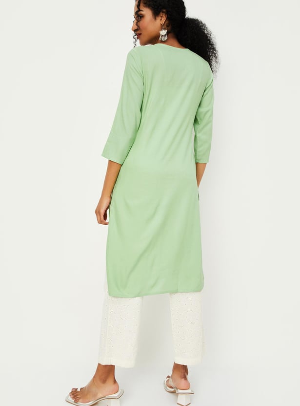 Create an effortless casual look with this straight kurta. It has a round neckline with an embroidery at the front and button closure, three-quarter sleeves and a pocket.