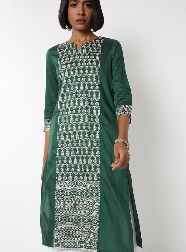 Add timeless charm to your wardrobe with this embroidered straight kurta, crafted for everyday elegance. It features a notch neck, 3/4th sleeves, side slits, and a convenient side pocket for functionality with style