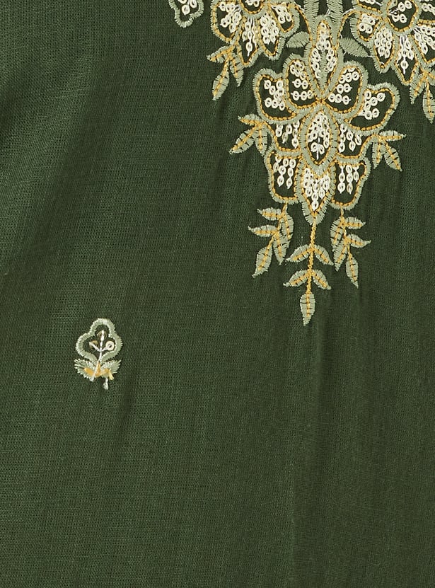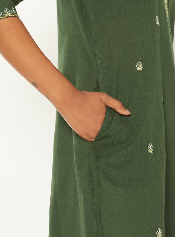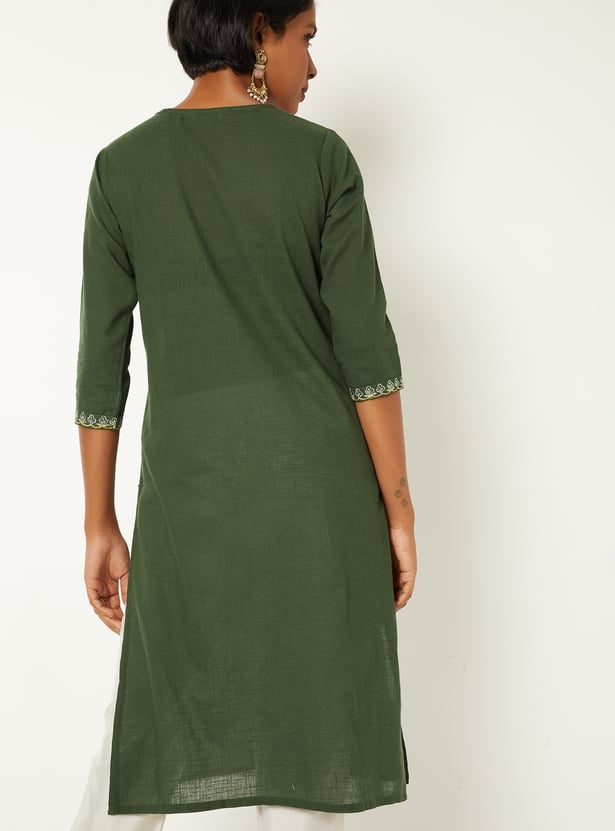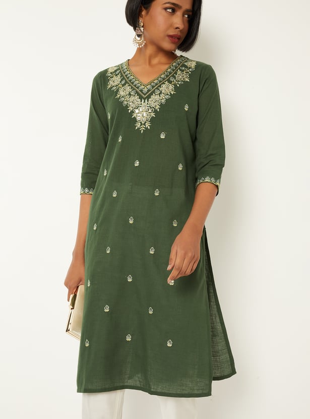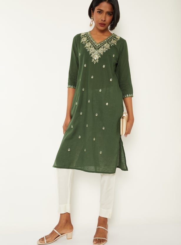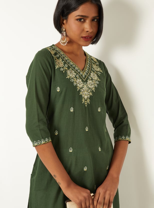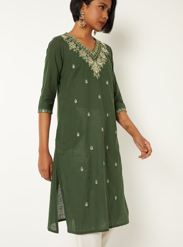 Elevate everyday elegance with this embroidered straight kurta, featuring a V‑neck, three‑quarter sleeves, a pocket, and side slits for comfort and charm.
