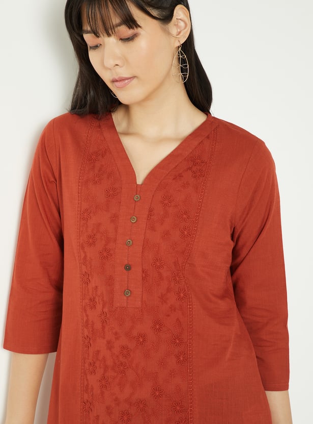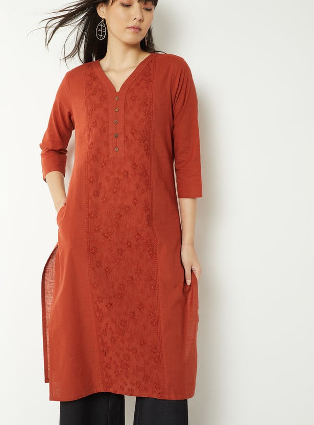 Elevate your ethnic wardrobe with this embroidered straight kurta, styled with a flattering V-neck and 3/4th sleeves. Side slits add ease of movement, while the practical side pocket blends utility with elegance.