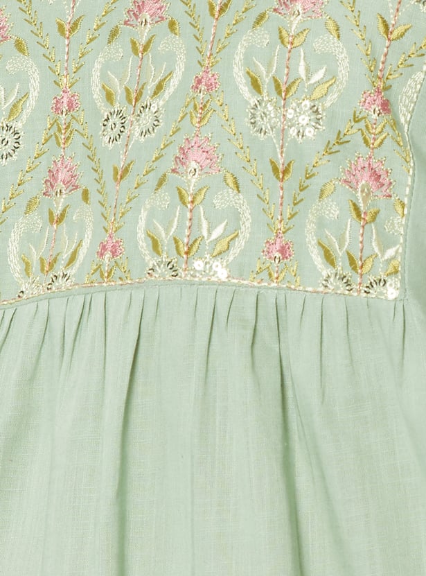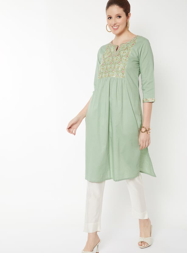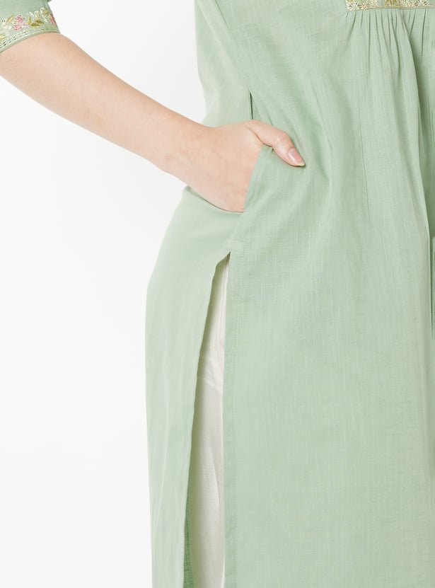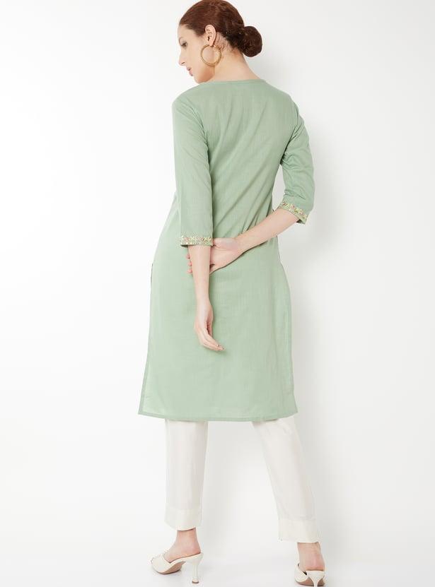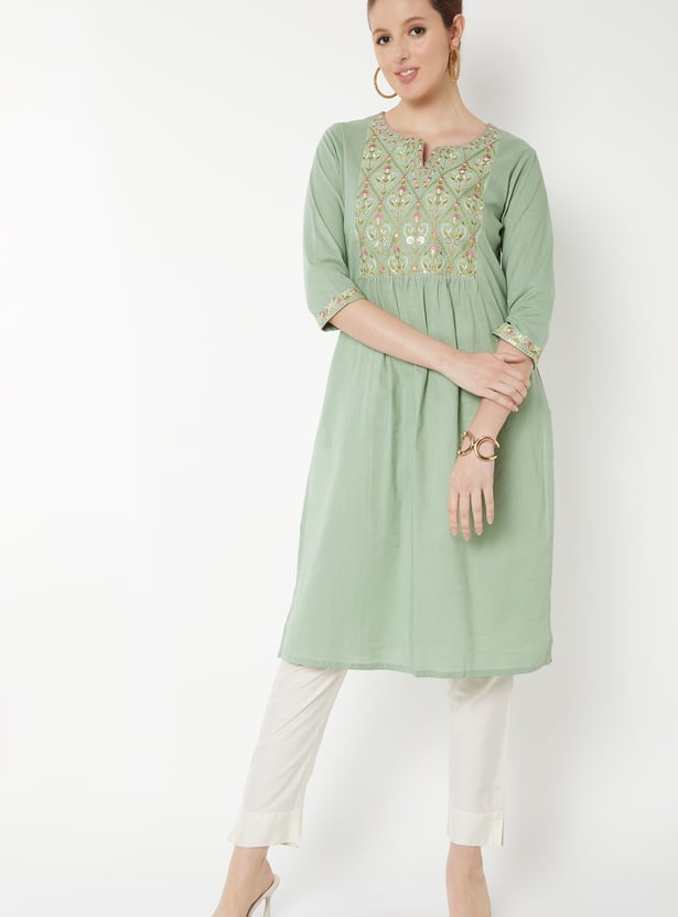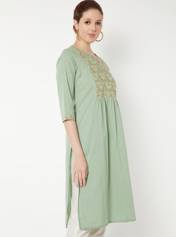 Elevate your ethnic style with this embroidered straight kurta, designed for timeless elegance. Featuring a round neck, 3/4th sleeves, and side slits, it combines delicate embroidery with a classic straight silhouette, perfect for both casual and festive occasions.