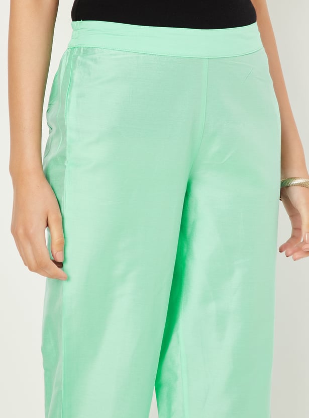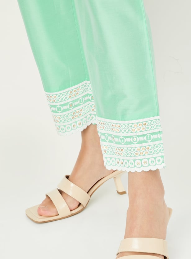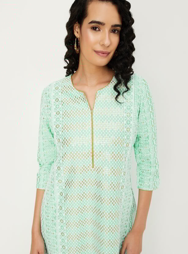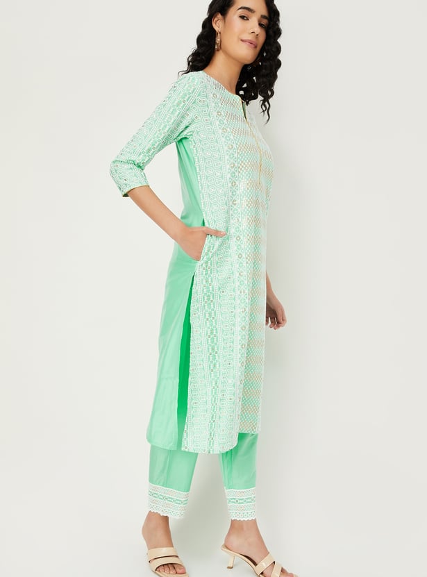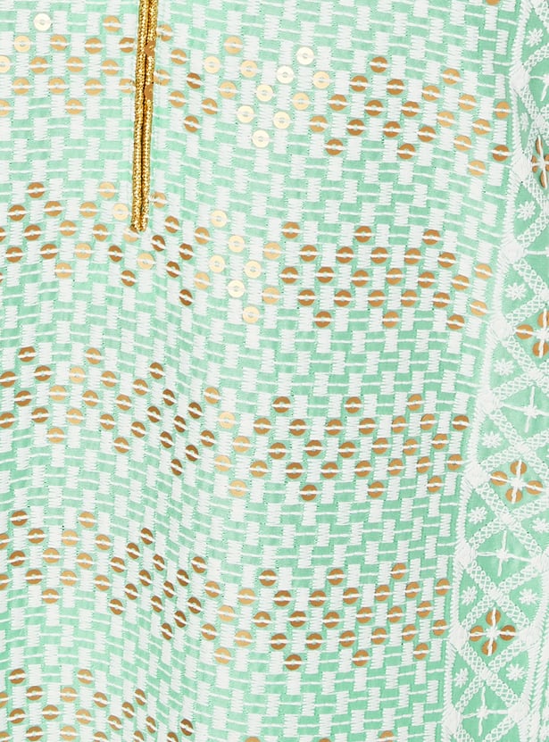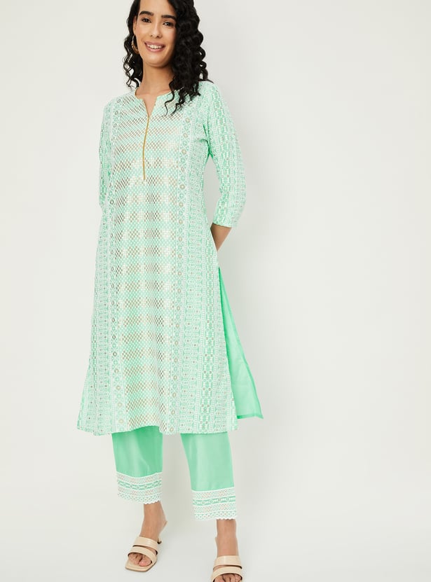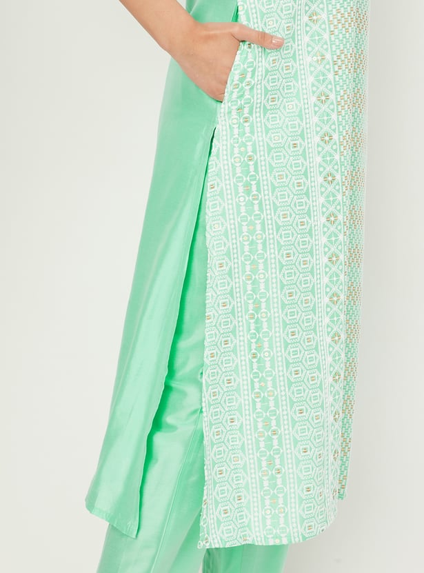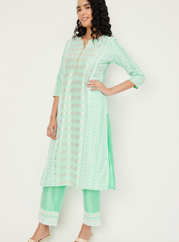 Flaunt your style with this kurta set, featuring a notched neck, three-quarter sleeves, and exquisite embroidery for an elegant touch. Paired with matching straight pants featuring an elasticated waistband, it's the perfect ensemble for any occasion.
