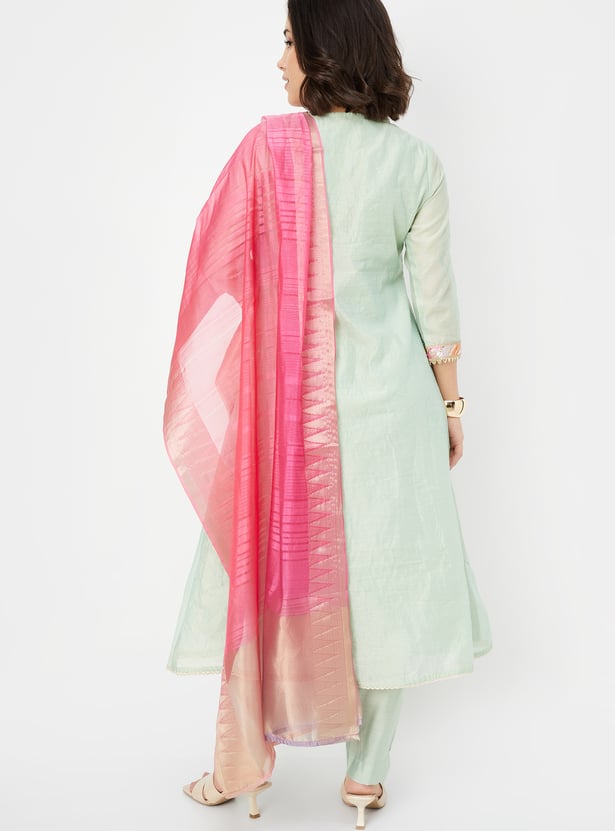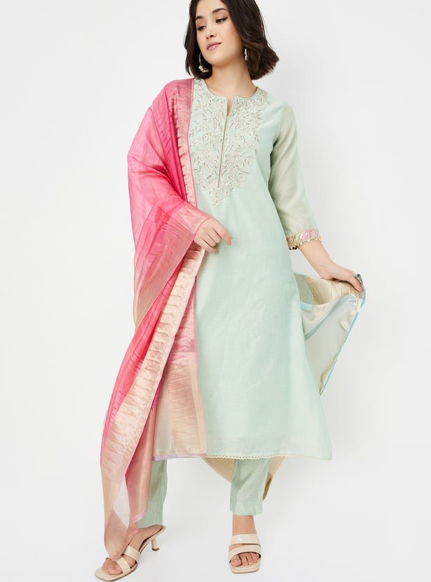 Embrace elegance with this embroidered A-line kurta set. Featuring a notch neckline, 3/4th sleeves, and straight pants with an elasticated waist, this ensemble combines style and comfort effortlessly. The set is complemented with a beautiful dupatta, adding a touch of sophistication.