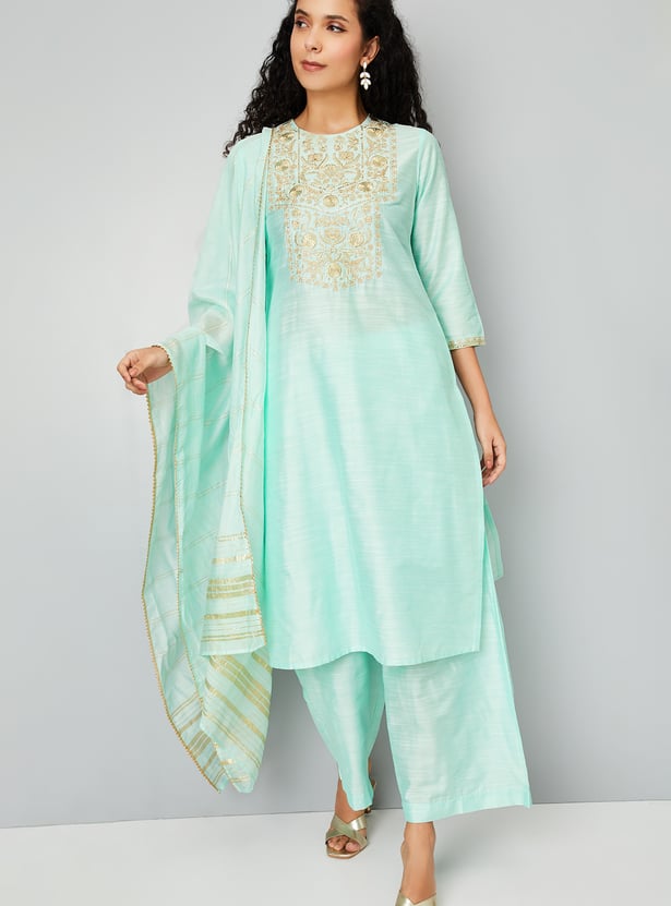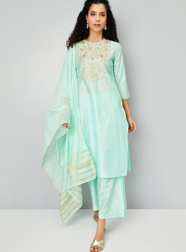 Elegant and effortless, this embroidered straight kurta set features a round neck and 3/4th sleeves. It’s paired with comfortable elasticated waist palazzos and a matching dupatta for a coordinated, graceful look.